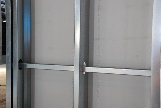 Le Promat SYSTEMWALL se compose d’un treillis en acier galvanisé, c.à.d. des profilés MC verticaux d’une épaisseur de 2 mm et des profilés MU 62.20 horizontaux d’une épaisseur de 2 mm également. Ces derniers sont glissés tous les 1350 mm à travers les ouvertures ovales dans les profilés MC. Sur ce treillis, on fixe de part et d’autre une double couche de panneaux PROMATECT®-100 de 8 mm afin d’obtenir une résistance au feu EI 60.