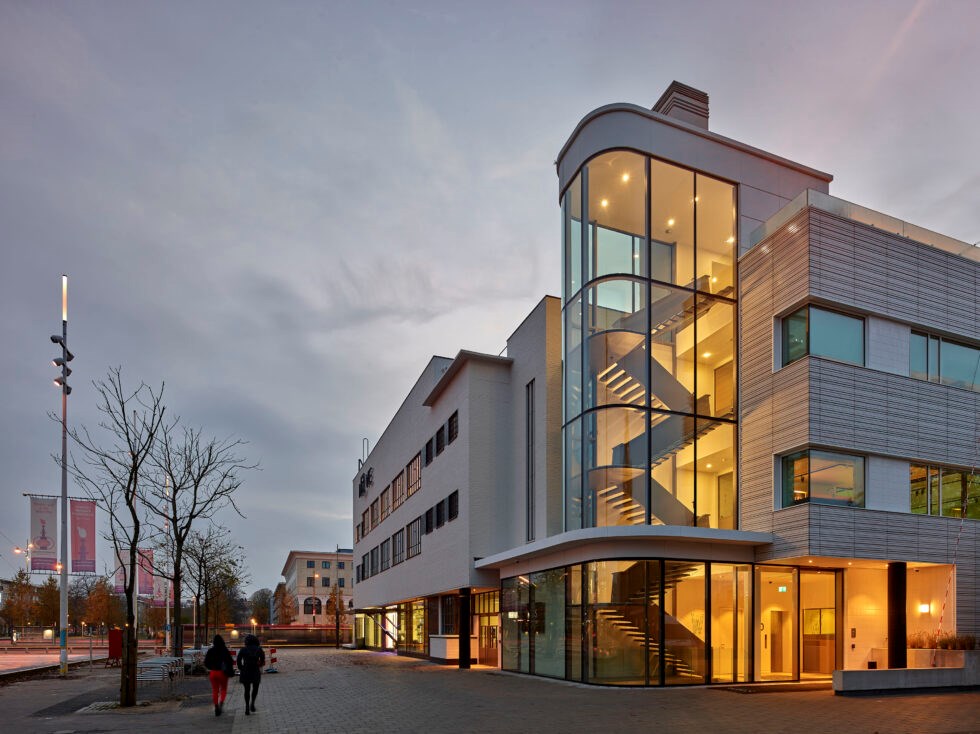 Une grande partie de l’atelier d’origine a été démolie et reconstruite. L’impressionnante salle de réunion sous verrière constitue le coeur du complexe. La forme de la nouvelle aile est inspirée de l’architecture existante de Wils. Les nouvelles façades sont revêtues de panneaux de céramique émaillés, qui correspondent à la couleur de la maçonnerie enduites de Keim du bâtiment existant. BiermanHenket a ajouté une remarquable entrée en verre et une cage d’escalier du côté du stade. Celles-ci sont d’aspect contemporain et indéniablement liées au volume rond de l’entrée originale.