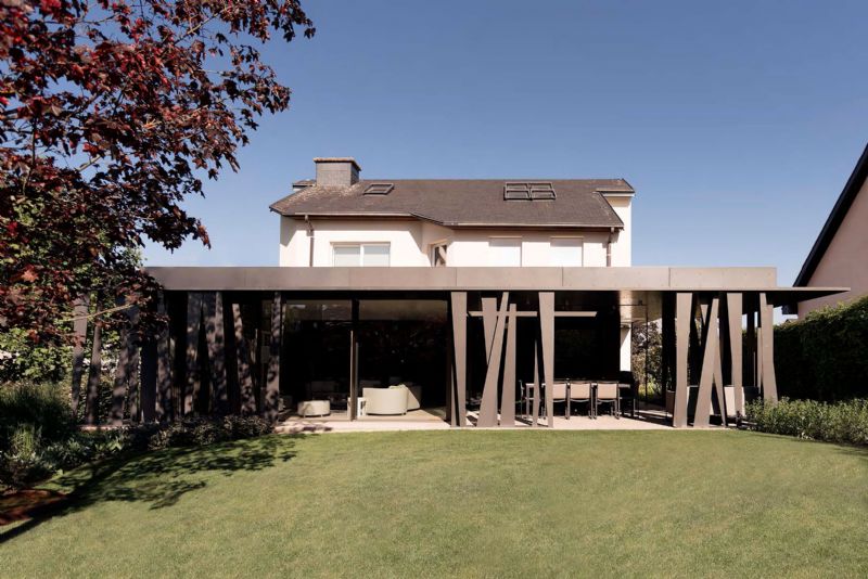 La mission confiée à l’architecte est à priori simple : ouvrir la maison existante, construite en 1996 dans une esthétique très «traditionnelle» vers le jardin et lui donner une apparence contemporaine. L’architecte a retenu le parti d’enlever tous les murs porteurs de la façade arrière au niveau du rez-de-chaussée au profit d’un agrandissement des espaces de séjour et d’une transparence vers le jardin. Le mur de l’étage de la façade arrière est repris par des structures portantes en acier, constituées de fines lamelles orientées toutes parallèlement à la maison. Ensemble, ces structures en acier cadrent le paysage du jardin, tout en garantissant une intimité aux espaces intérieurs. La géométrie différente des éléments, tantôt rectangulaire, trapézoïdale, triangulaire et leur disposition irrégulière en plan, forment un paravent léger qui joue avec la lumière et font du paysage autant de tableaux qu’il y a de perspectives visuelles. La terrasse couverte, délimitée par des éléments analogues, devient espace intérieur autant qu’extérieur.