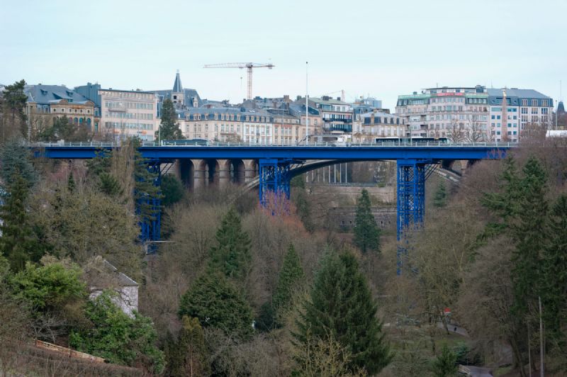 Le pont Adolphe situé au centre de Luxembourg, inauguré en 1903, devait subir d’importants travaux de restauration qui ont nécessité sa fermeture durant plus de deux ans. Un second pont, situé à 30 m seulement du pont Adolphe, a été construit pour relier provisoirement le centre-ville avec le quartier de la gare. La solution acier s’est immédiatement imposée en réponse des deux impositions. D’une part, réduire autant que possible la durée de construction de l’ouvrage provisoire, d’autre part l’ériger au moindre coût. La variante technique proposée par le groupement adjudicataire consista à réaliser une structure très simple: quatre poutres longitudinales continues qui portent un platelage métallique non collaborant. Les piles sont constituées par empilement d’ensembles triangulés. L’assemblage des éléments (poutres et palées) a été réalisé sur une plateforme située derrière la culée, et ces éléments furent posés au fur et à mesure par une grue progressant sur le tablier. Cette solution a permis de ne pas travailler en fond de vallée. Il n’aura fallu que quatre mois pour poser les 174 m de pont.