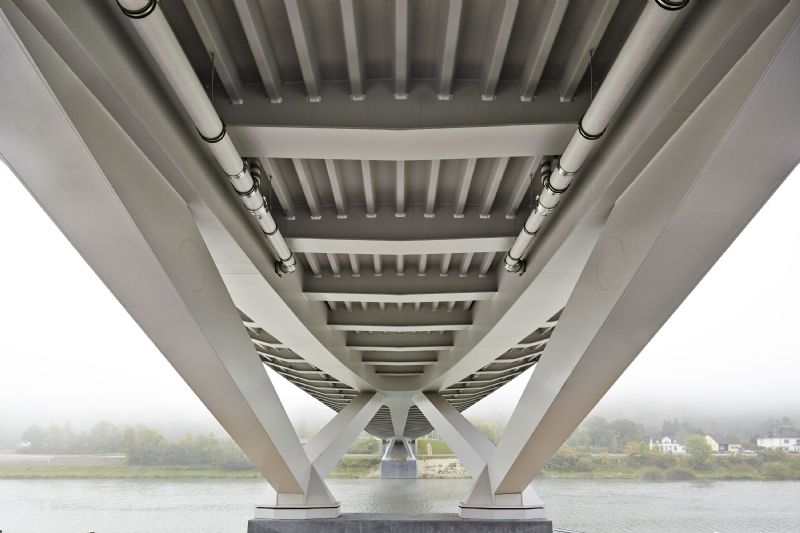 Le tout nouveau pont routier relie la commune luxembourgeoise de Grevenmacher à Wellen, une petite ville sur la rive allemande. Ce pont métallique à quatre travées, présente une longueur totale de 213 m. La travée principale, pièce maîtresse, a une portée de 113,80 m entre les piles des berges. L’intégration des travées d’approches avec la travée principale est caractérisée par une ondulation continue qui transite par les quadripodes sous le tablier pour passer dans l’arc central et continuer sa course vers la berge opposée en un mouvement symétrique. Le tablier métallique est constitué d’une dalle orthotrope reposant sur des poutres transversales en profilés reconstitués et soudés. La géométrie de l’ouvrage est telle que la travée principale est autoportante, élément capital pour permettre le transport. En effet, celle-ci a été fabriquée dans le port de Mertert, pour être transportée sur la Moselle jusqu’à sa position finale à Grevenmacher. Quatre mois et demi, c’était le temps à disposition pour démolir le pont existant avec ses fondations et reconstruire le nouvel ouvrage en acier.