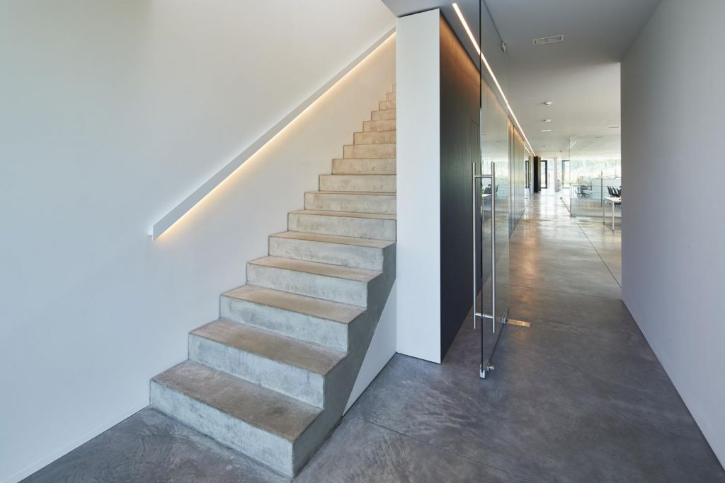Le bâtiment n’est pas passif mais le maître d’ouvrage a souhaité dépasser les exigences minimales en matière de PEB en mettant 16 cm de polyuréthane en toiture et 12 cm en façade. L’intérieur du bâtiment traduit également les souhaits de sobriété du maître d’ouvrage. Tapis plain et béton poli au sol et stores et luminaires intégrés dans les faux-plafonds. Le chauffage par le sol et la ventilation double flux en trois ou quatre voies sont autant de détails qui reflètent le souci de finition élévé du maître d’ouvrage.