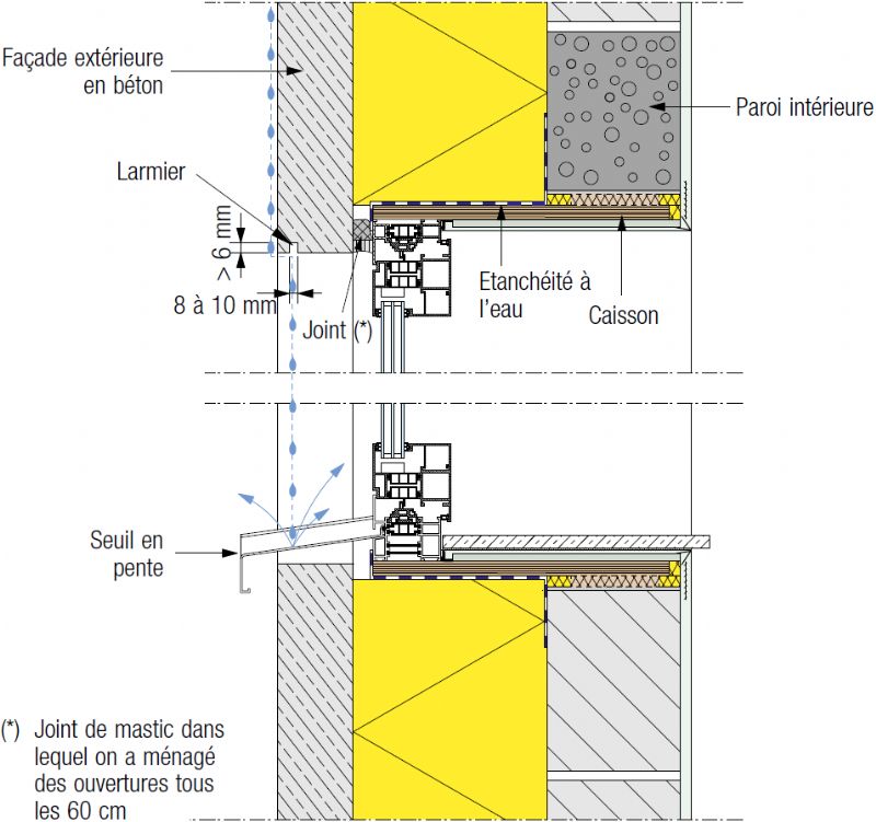 La partie inférieure des éléments de façade en saillie ou en béton doit être pourvue d’un larmier (casse-gouttes) adéquat, afin d’éviter que les eaux pluviales ne s’écoulent sur le châssis et le vitrage. Ce larmier aura de préférence une largeur comprise entre 8 et 10 mm, et une profondeur de 6 mm. Pour éviter que la chute des gouttes ne laisse des dépôts sur les profilés inférieurs de la menuiserie et la partie basse du vitrage, le seuil doit être pourvu d’une inclinaison relativement importante. Dans la pratique, les seuils ont toutefois souvent une pente de l’ordre de 5°.