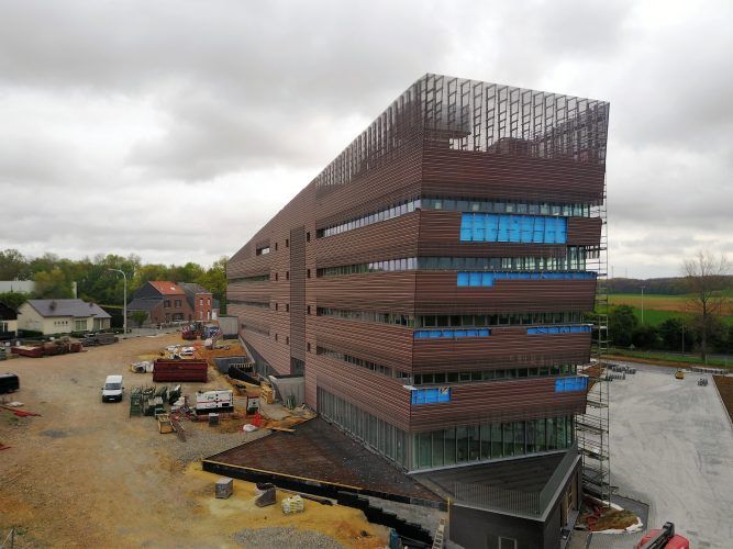 Le bâtiment présente un volume singulier et se profile comme une balise dans le paysage. Il exploite la topographie en offrant différents accès au niveau du sol. Le bâtiment est plus bas-côté rue et fortement ouvert sur la campagne. Un design remarquable par conséquent, et un bâtiment qui, au vu de sa surface, aurait pu être très massif. Le bâtiment a cependant un aspect très organique, comme s’il s’intégrait au terrain, et très léger, une fine peau, grâce au bardage de façade en zinc dans l’aspect de surface PIGMENTO Rouge. Le zinc prépatiné et teinté suscite cette sensation de ‘terre’ et de ‘fine peau.”