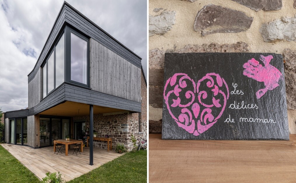Les lames de bois verticales apportent chaleur et contraste, se mariant harmonieusement avec la brique et la pierre d’origine. Les ardoises de la façade, disposées horizontalement, soulignent la structure comme un socle élégant, ajoutant une touche distinctive à l’ensemble.