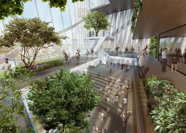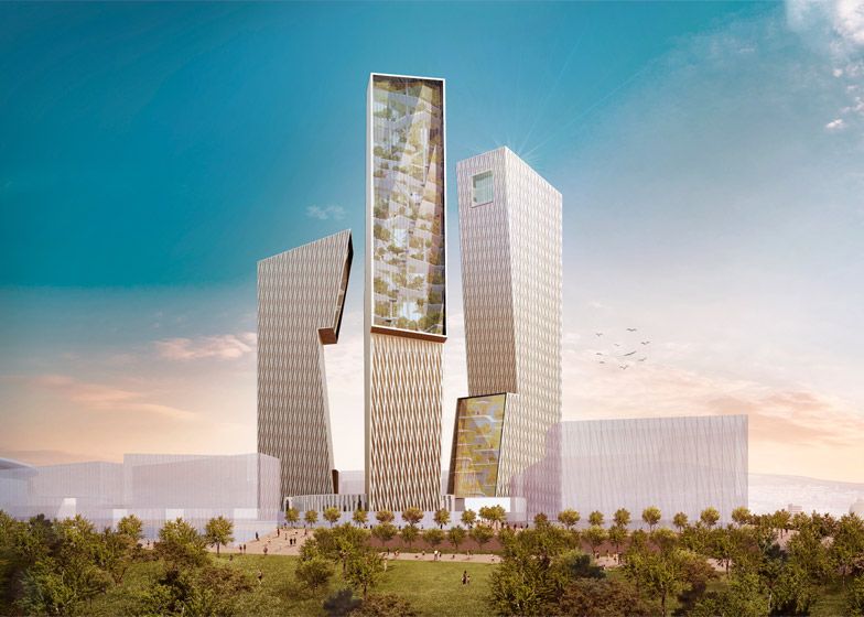 Les tours aux formes anguleuses font un peu penser aux Trimphones, ces téléphones design qui ont fait fureur dans les années soixante en Grande-Bretagne. L'architecte a d'ailleurs annoncé que les bâtiments allaient donner l'apparence de converser entre eux. Son intention est de donner l'illusion que les trois gratte-ciel ont été découpés dans un même bloc. Il explique : « Les volumes s'emboîtent les uns dans les autres comme les blocs de construction de l'Antiquité. On obtient ainsi une composition d'éléments qui sont à la fois liés les uns aux autres tout en étant distincts. » Chaque tour a une hauteur différente, la plus haute s'élevant à 220 mètres.