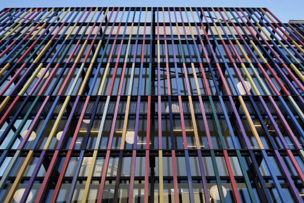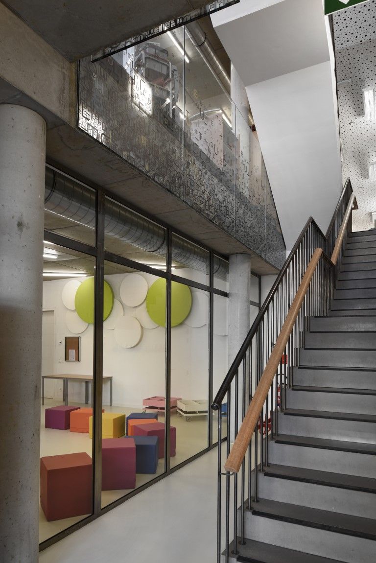 La façade qui donne sur l’intérieur d’îlot et la cour de l’école voisine offre aujourd’hui une toile ludique aux usagers par un brise-soleil coloré. Une attention particulière a été portée à l’énergie et l’écologie. La nouvelle toiture est verdurisée et une perméabilité visuelle depuis la rue Haute vers l’intérieur d’îlot est encouragée. En regard du contexte urbain dense, une attention particulière a été apportée à la lumière naturelle dans le bâtiment et à l’impact du projet sur son contexte environnant.