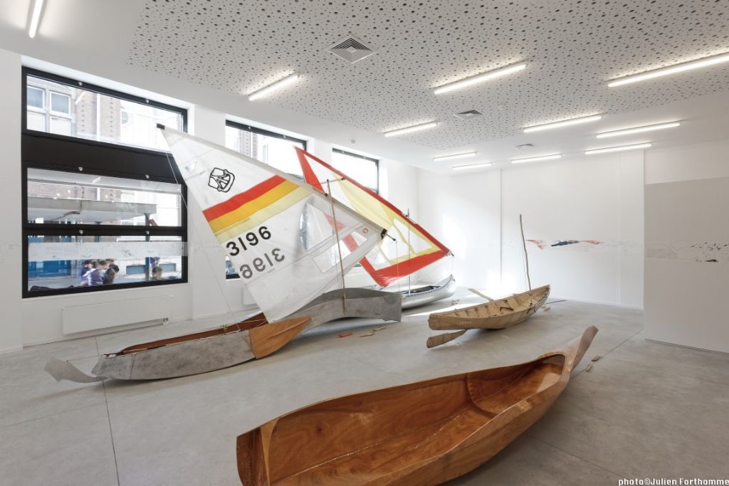 La façade du bâtiment intègre l’oeuvre « Eloge de la Fuite » du sculpteur Marco Dessardo qui détourne l’ensemble des eaux pluviales et les fait rigoler par des gouttières du toit jusqu’au pied du bâtiment. Ce cheminement est parsemé de chicanes, de fuites et de détournements.