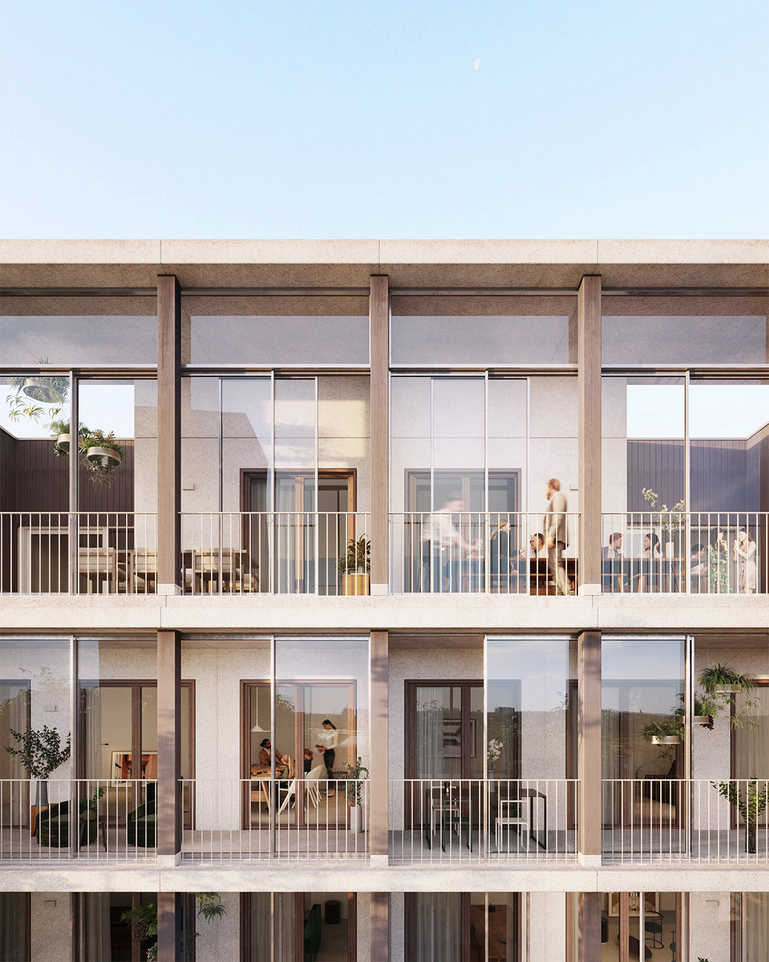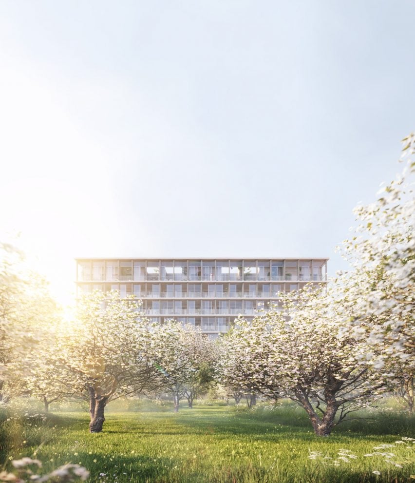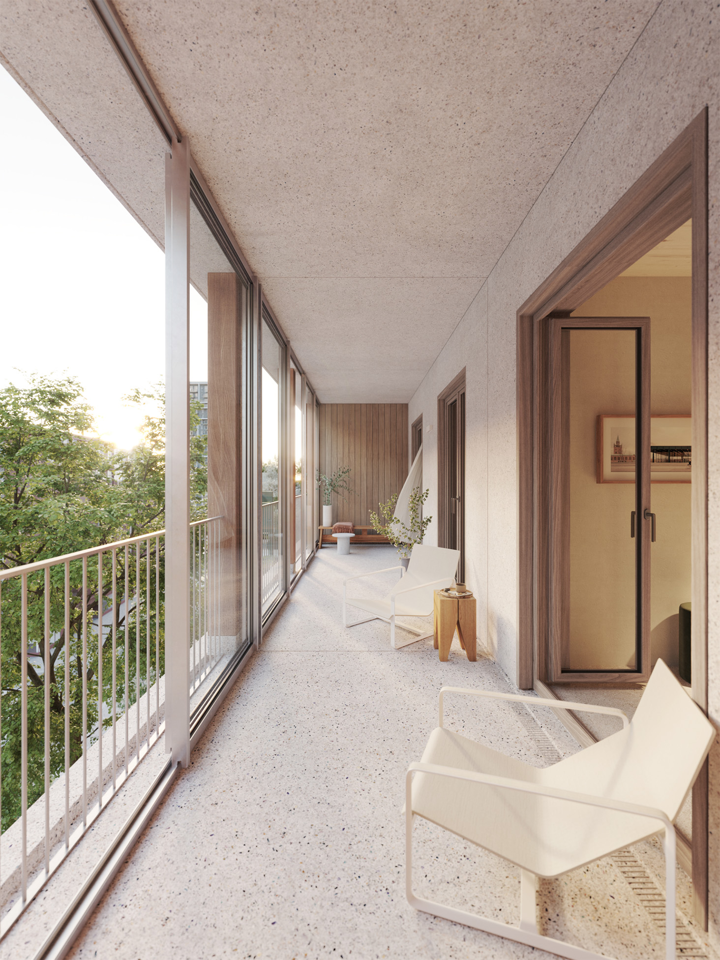 Le bâtiment sera construit en combinant le bois lamellé-croisé (CLT) et le béton afin de réduire les émissions de CO2, tandis que les appartements seront conçus pour répondre à des normes strictes en matière d'énergie et d'isolation. Des jardins d'hiver entourent l'extérieur du bâtiment et sont attenants à chaque appartement pour former des terrasses couvertes. Les jardins d'hiver offrent aux logements une couche supplémentaire entre l'intérieur et les éléments, ce qui permet d'améliorer l'isolation.