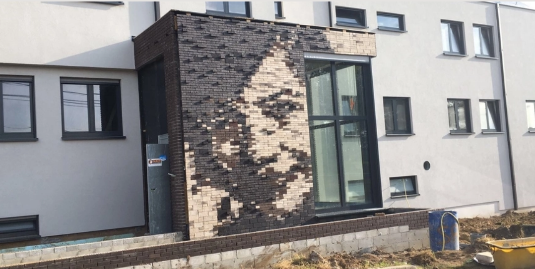 L'artiste a voulu intégrer le visage de Martine dans la façade, entièrement en brique. Le système de façade Signa lui a offert toutes les possibilités de travailler l'image en 3D. Vandersanden s'est occupé de tous les matériaux : panneaux arrière, colle et plaquettes de parement sur mesure. L'artiste a lui-même collé les plaquettes selon un motif qu'il avait dessiné. Ensuite, les panneaux de façade prêts à l'emploi ont été montés contre la façade du hall d'entrée.
