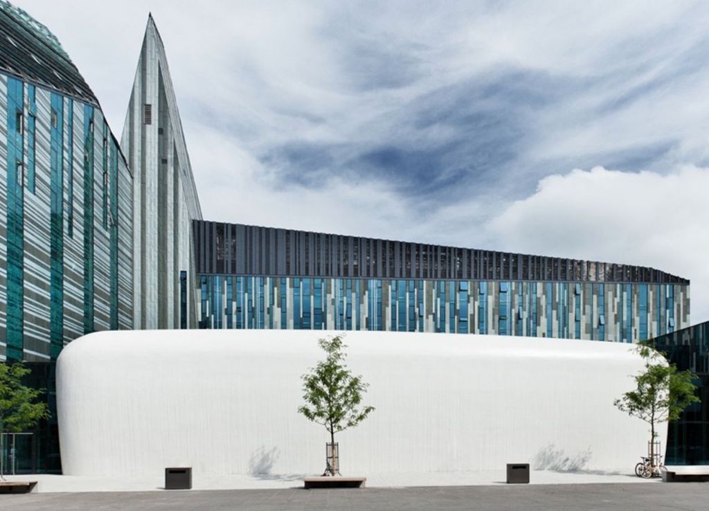 Ces formes organiques blanches abritent l’auditorium de l’Université de Leipzig. Ce gros galet forme un contraste saisissant avec les lignes droites et l’aspect classique des bâtiments adjacents. L’auditorium Audimax, qui peut accueillir 800 personnes, est une interprétation contemporaine de l’ancienne église universitaire qui se trouvait à cet endroit. L’architecte Erick van Egeraat est responsable de la conception de l’ensemble du bâtiment de l’université.