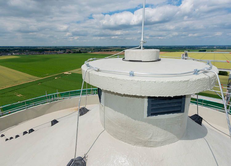 Avec une taille de 50 m, le château d’eau de Juprelle est le plus haut de la région liégeoise et l’un des plus hauts de Wallonie. Outre une réparation de la poutre en béton armé - un geste technique pas facile -, le vrai challenge consistait à réparer l’étanchéité de la cuve et de la toiture en dôme à une telle hauteur (une surface à traiter de 285 m2).