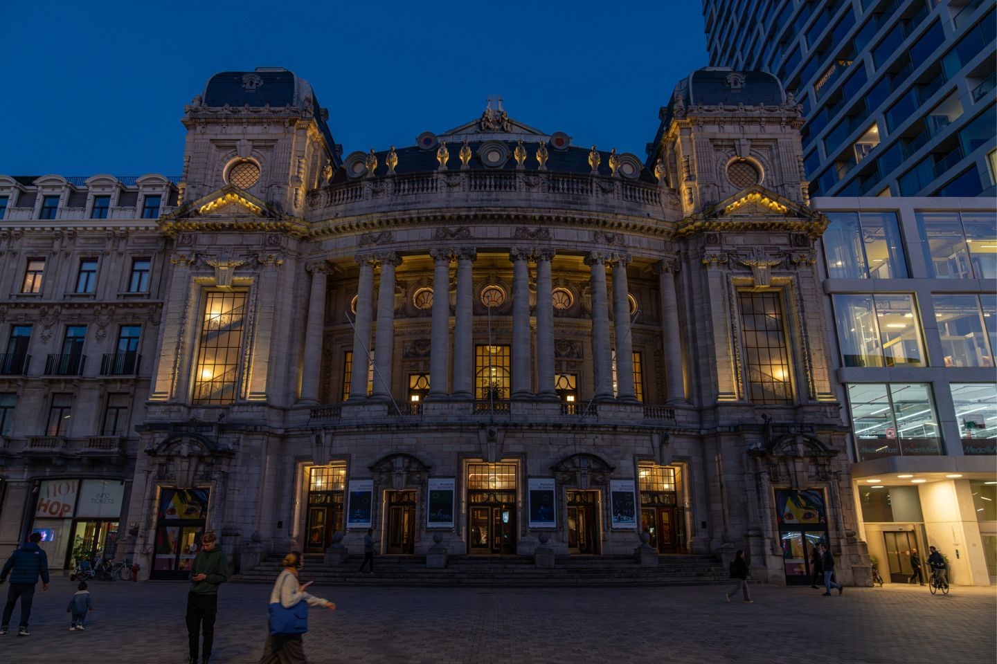 Des projecteurs dirigés vers les escaliers et la place qui invitent les passants à découvrir l’offre culturelle de l’Opera Ballet Vlaanderen.
