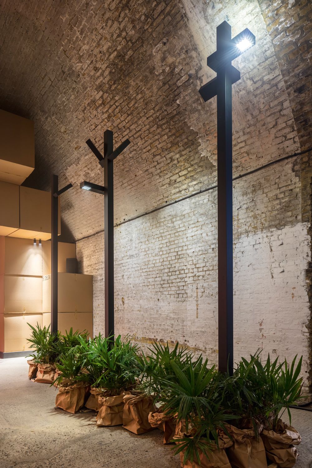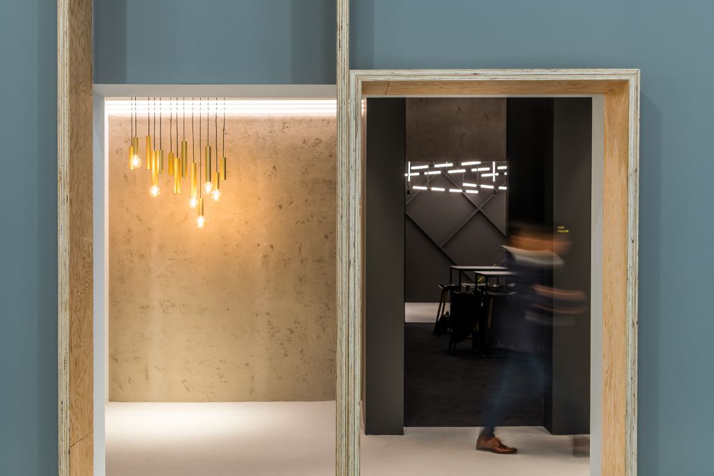 La pièce maîtresse du stand est sans conteste la façade. Sur tous les côtés du stand, les murs épurés se combinent à une impressionnante grille composée de 50 portes et 70 encadrements en bois, qui s’élèvent jusqu’à 8 m de hauteur. « L’idée de base du concept consiste à utiliser un élément d’intérieur stéréotypé et très reconnaissable – la porte et son encadrement – pour le transformer en une structure étonnante grâce à une composition linéaire et répétitive. Le fait de placer les portes à des hauteurs inhabituelles apporte un cachet surréaliste à la façade. »