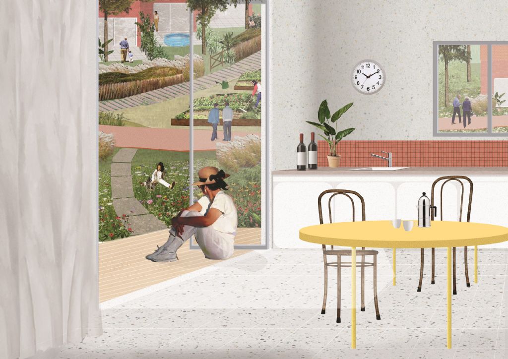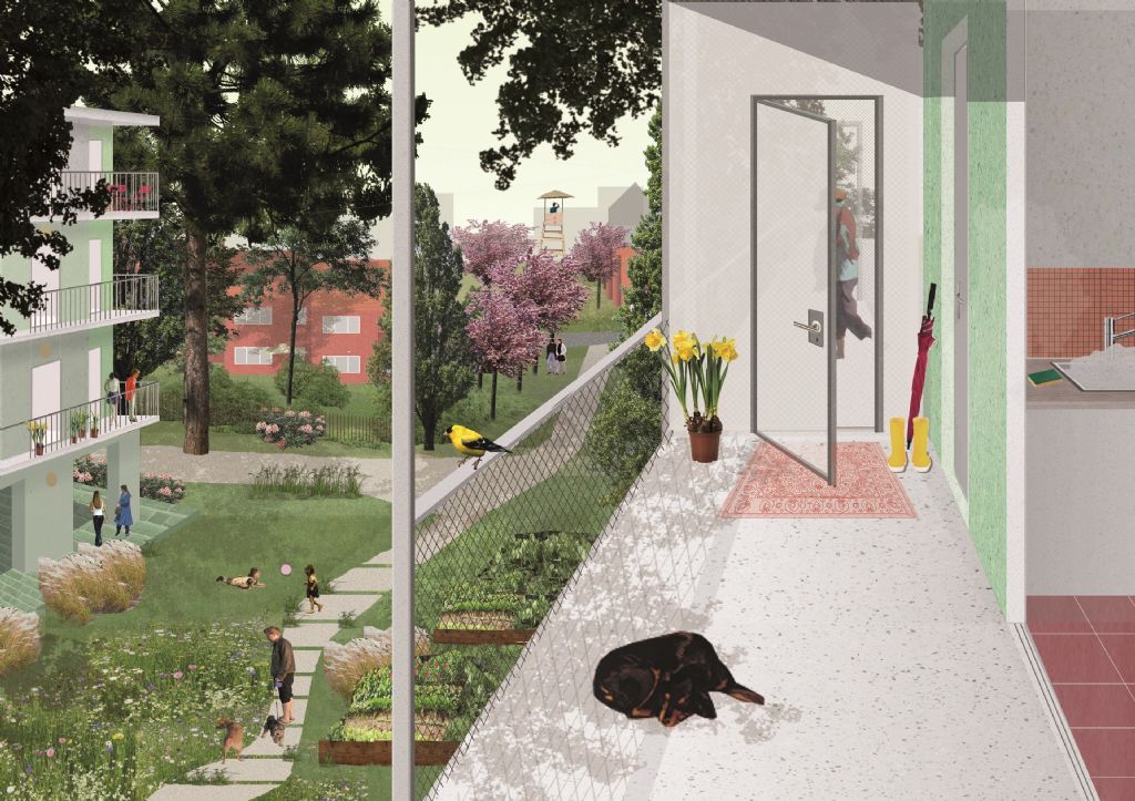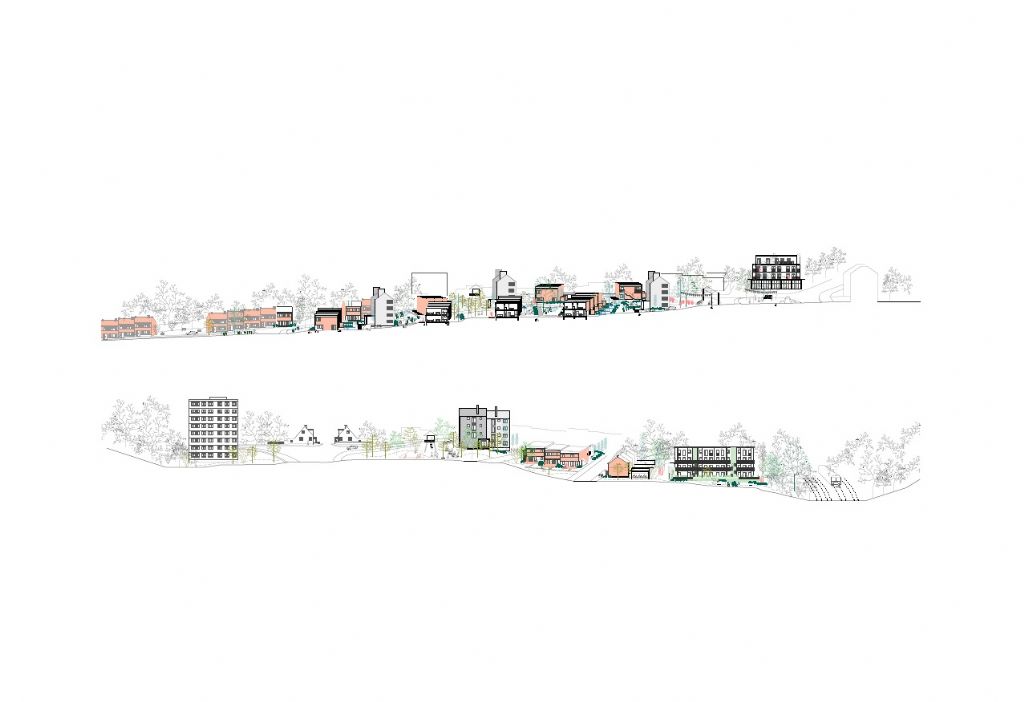 51N4E-COLOCO et BAS font une ici une proposition paysagère approfondie qui réussit non seulement à hiérarchiser les espaces et à recréer de l’intimité à proximité des logements, mais également à ouvrir le site et à y créer de nouvelles traversées. Par ailleurs, le projet ambitionne de créer de nouveaux ‘espaces publics’ qui pourraient fonctionner comme des attracteurs sociaux. C’est ainsi une cité jardin de demain, intégrant les habitants au changement du quartier.