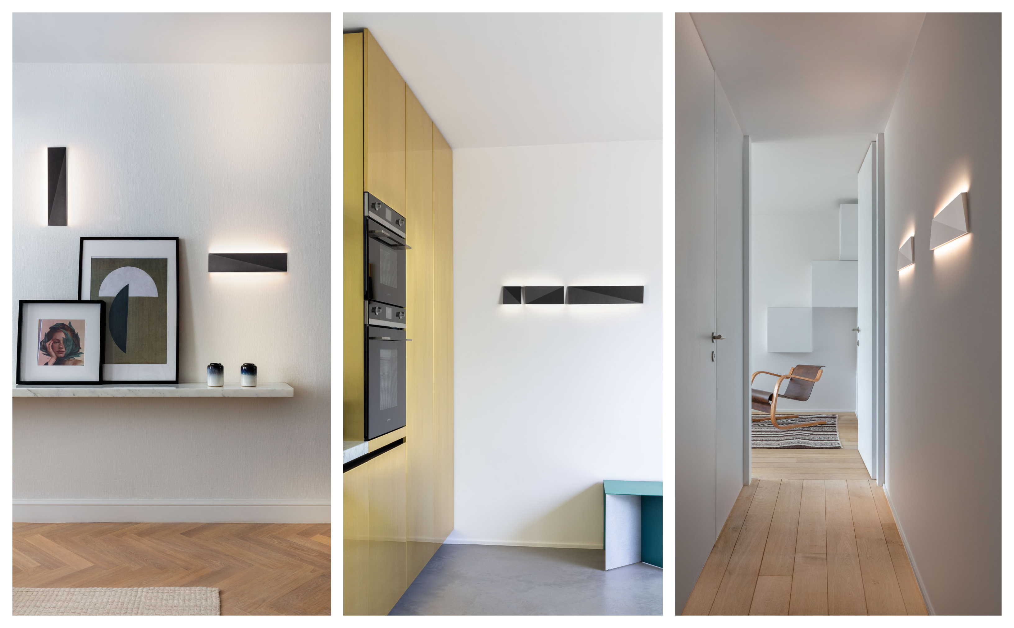 La lumière du soleil joue avec la pliure diagonale du design minimaliste ultra fin en offrant un subtil jeu d’ombres. Quand l’obscurité s’installe, Dent L dévoile la lueur chaude du luminaire mural d’ambiance. Une création dualiste qui se prête à des compositions ludiques et à des expérimentations alliant art et design.
