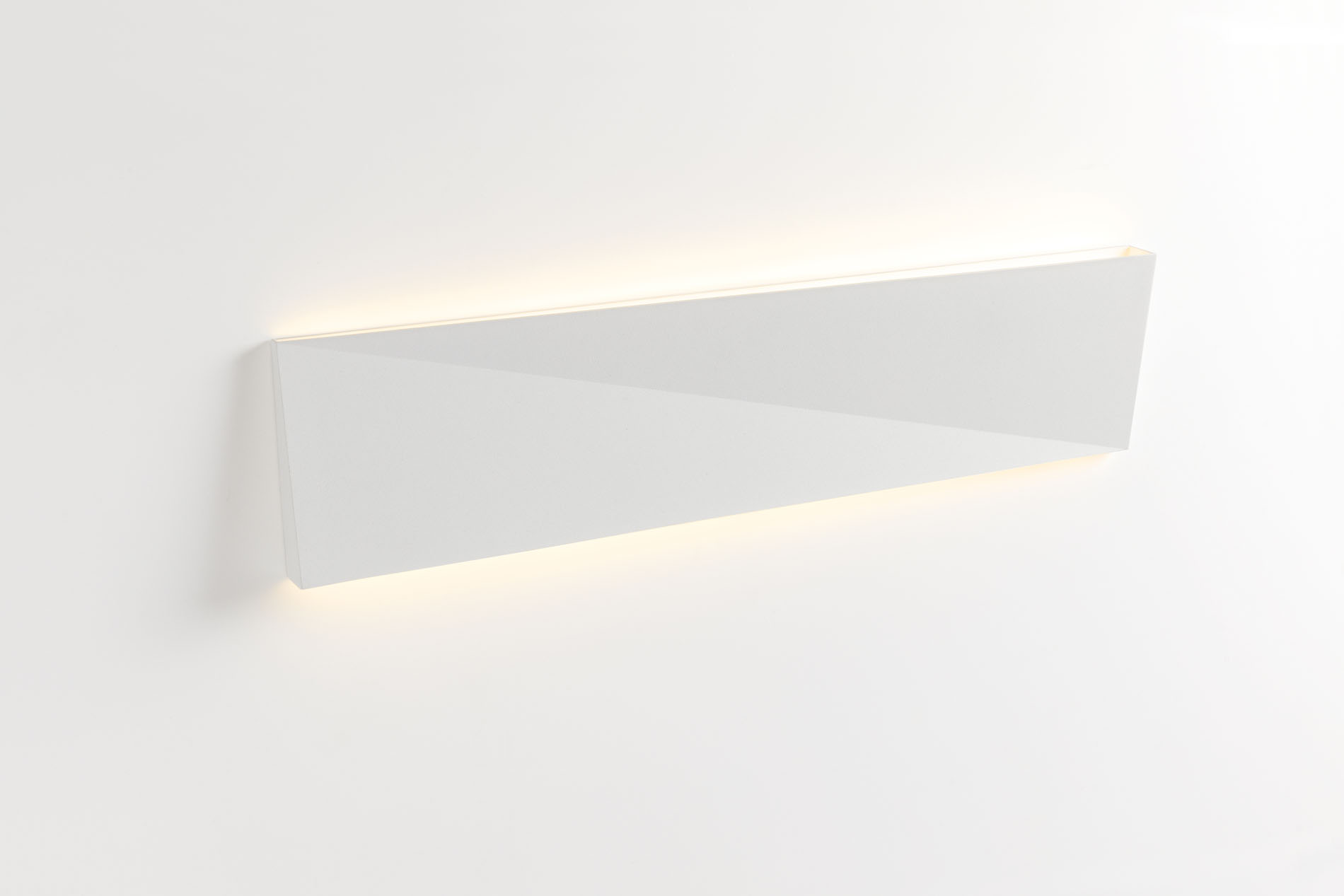 Tout comme ses deux plus petits comparses Dent S et Dent M, Dent L est une création angulaire qui présente une pliure diagonale sur toute sa longueur, d’un bord à l’autre, comme si quelqu’un tentait de plier deux points opposés l’un sur l’autre. Sur la gauche et la droite, ou le dessus et le dessous, selon le sens dans lequel vous placez Dent, la douce lueur des bords dotés de LED – filtrée à travers les plaques de diffusion – éclaire le mur et confère une lumière chaleureuse à la pièce.