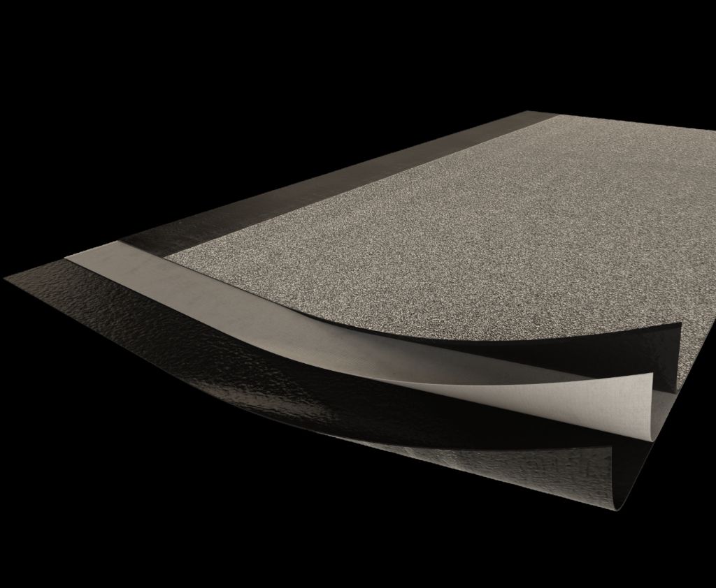 - En face inférieure : un liant spécifique développé par l’équipe R&D de Derbigum. Ce liant d’ETB (Easy Torch Blend) a été développé pour faciliter la pose de la membrane en toute saison. La fonte du liant bitumineux est, dès lors, accélérée tout en assurant une parfaite adhérence aux supports.