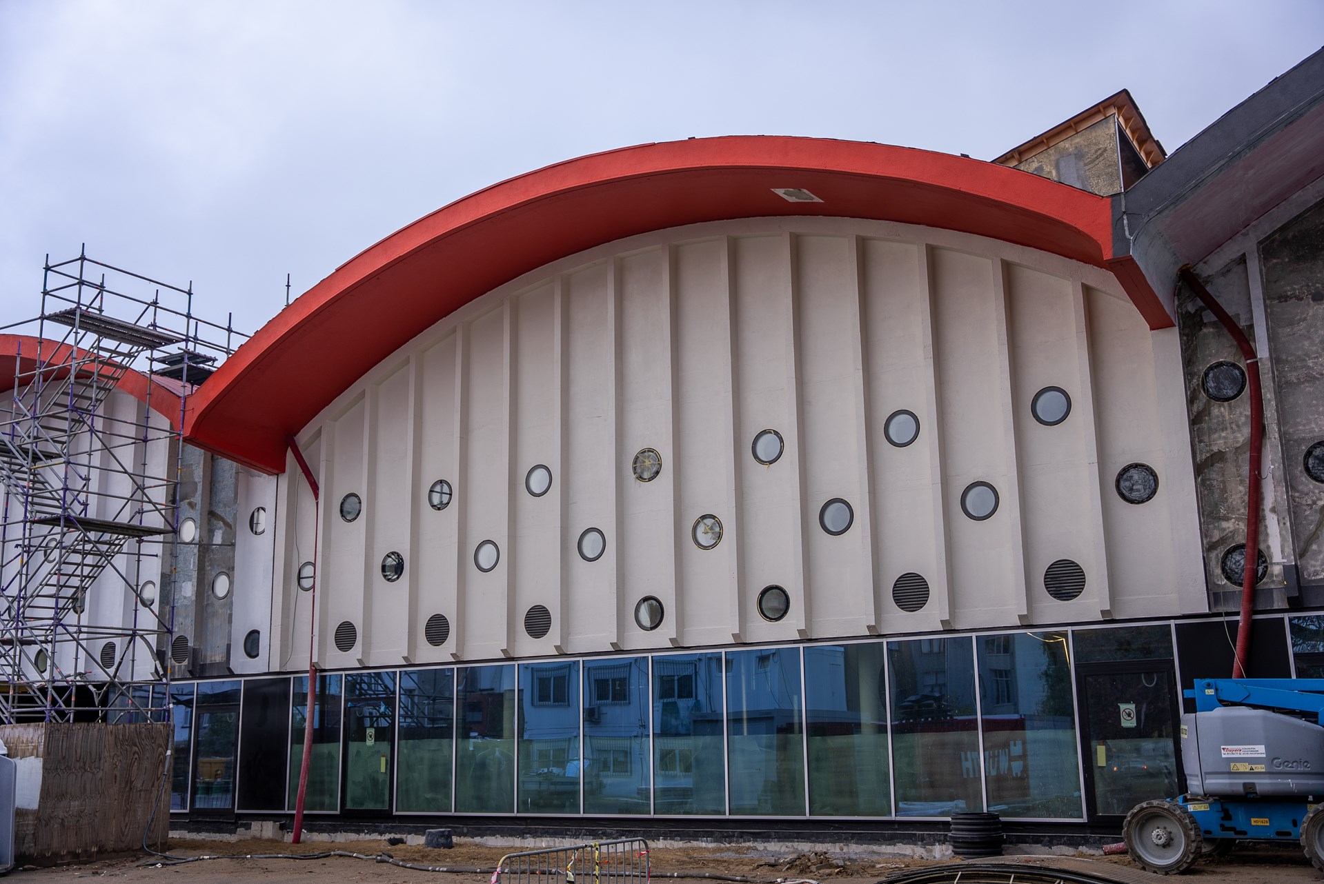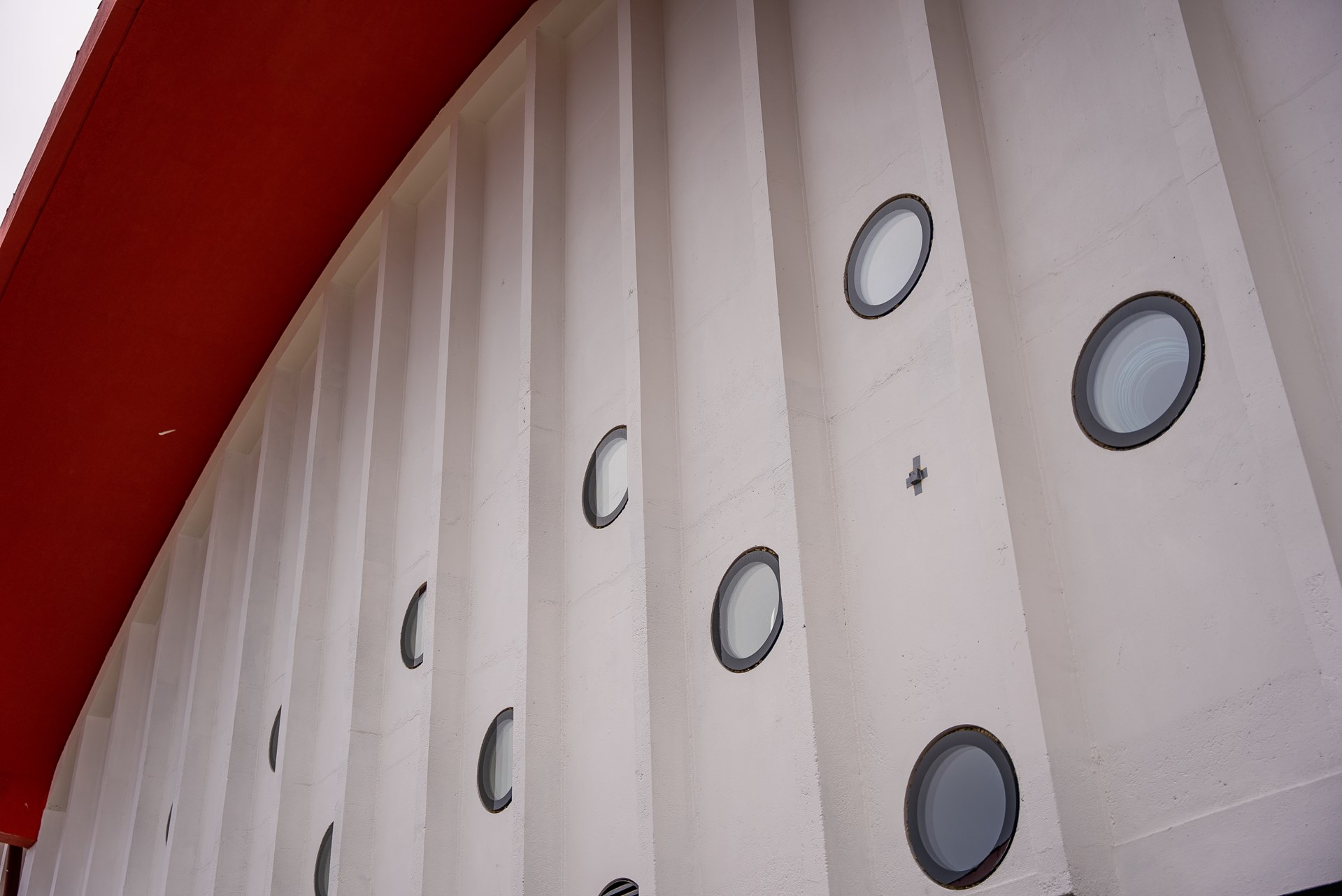 Le site se caractérisait avant tout par sa structure en béton emblématique malheureusement endommagée. Il était nécessaire de protéger à nouveau le béton de manière optimale et de le rendre étanche, afin d’éviter que des problèmes ne se produisent au cours des prochaines décennies. Le concept d’origine de l'architecte prévoyait initialement la pose d’un système d’isolation StoTherm Classic® sur les façades. Vers la fin de la phase de conception, l'équipe de construction a cependant décidé, après concertation, de procéder à une isolation par l'intérieur. Par conséquent, l'enveloppe extérieure de la façade ainsi que les arches rouges du toit allaient devoir être dotées d’une protection durable. Sto s'est avéré le fournisseur de systèmes idéal pour modifier le parachèvement de la façade en passant d'un système d'isolation Sto à un système de revêtement Sto aux propriétés spécifiques.
