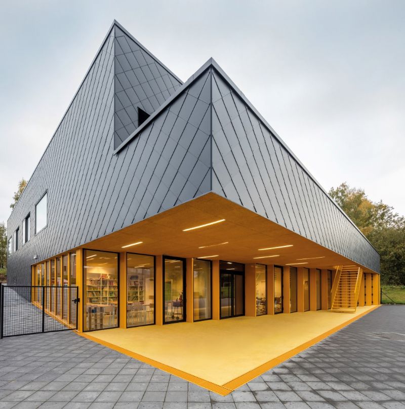 Des études ont démontré qu’un beau bâtiment avait une influence positive sur le processus d’apprentissage. On l’a bien compris dans cette école. Les ardoises gris perle posées en diagonale forment une combinaison parfaite avec les accents jaunes et créent une architecture ludique et pleine d’imagination qui fait l’unanimité tant auprès des élèves que des enseignants. (Ector Hoogstad Archtitecten)