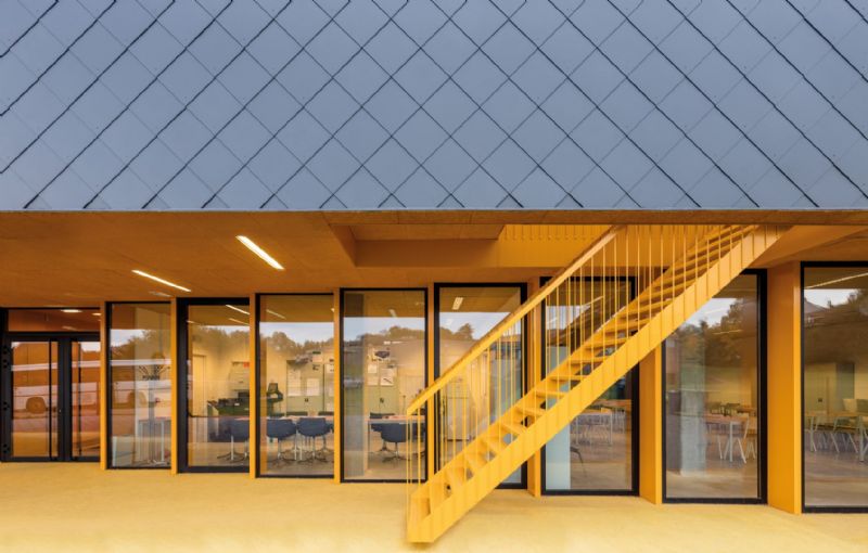 Le choix osé des couleurs est du plus bel effet. Les marches, l’entrée principale et l’entrée latérale aspirent littéralement les élèves à l’intérieur et leur donnent envie d’aller à l’école. (Label Architecture)