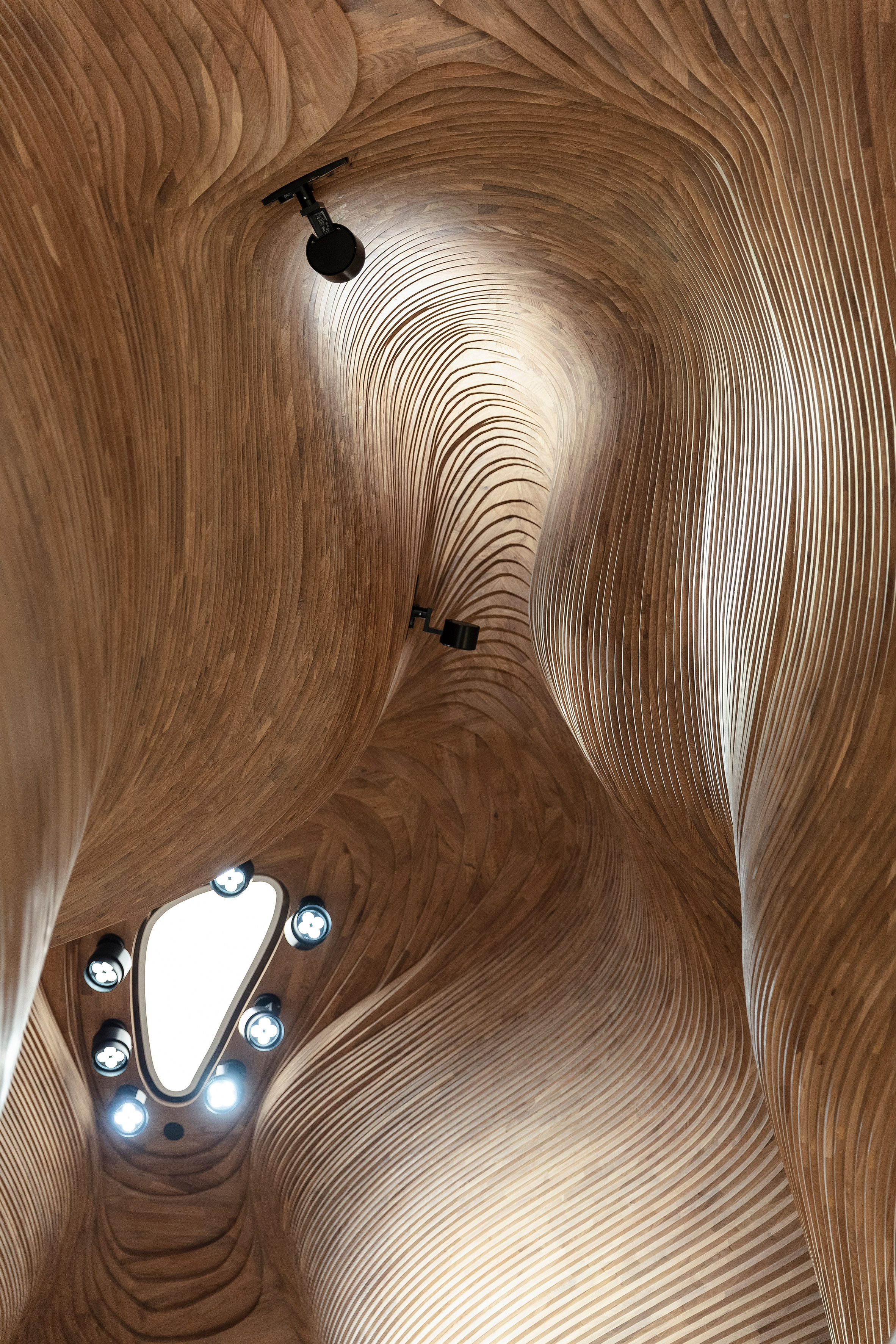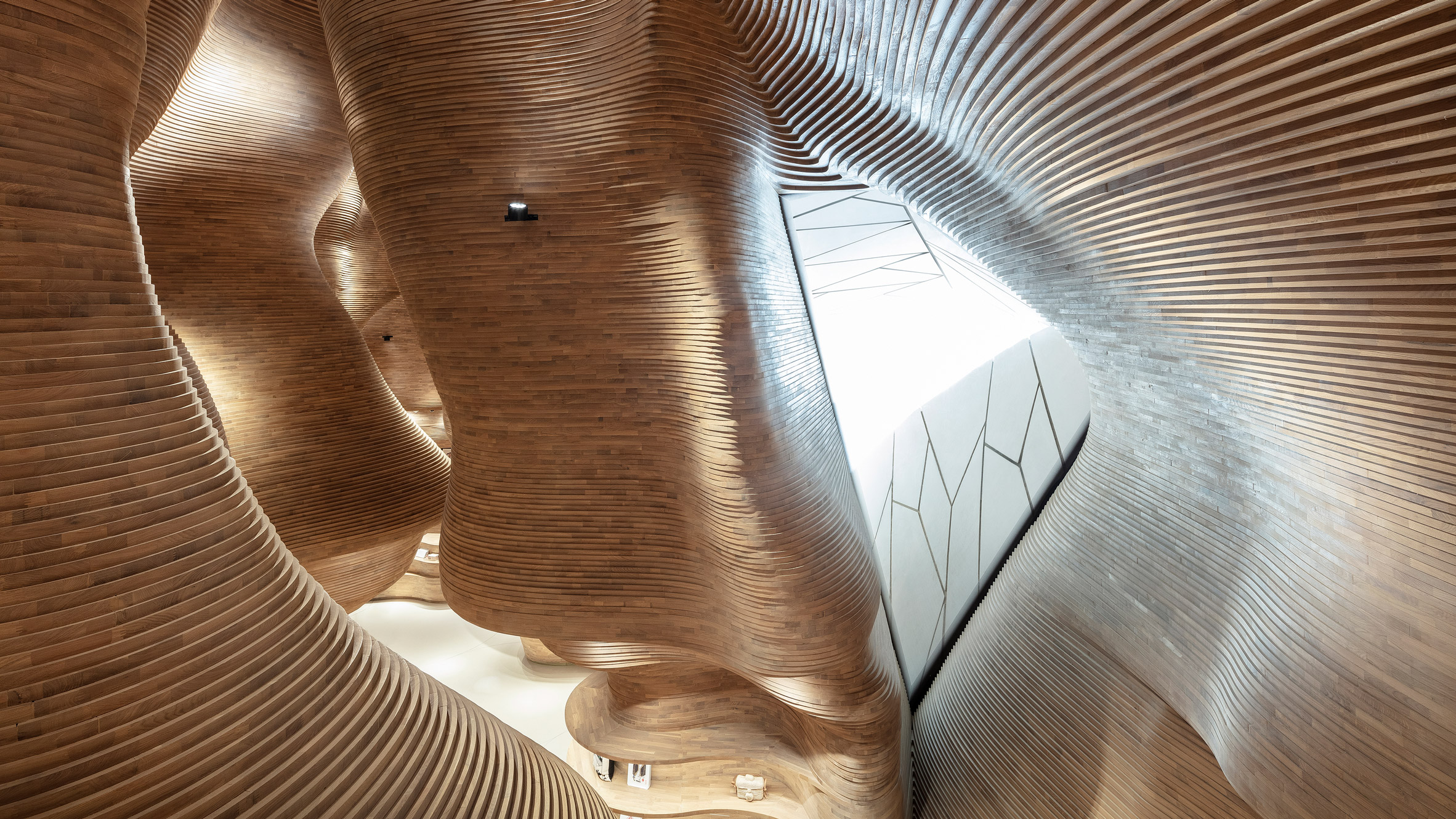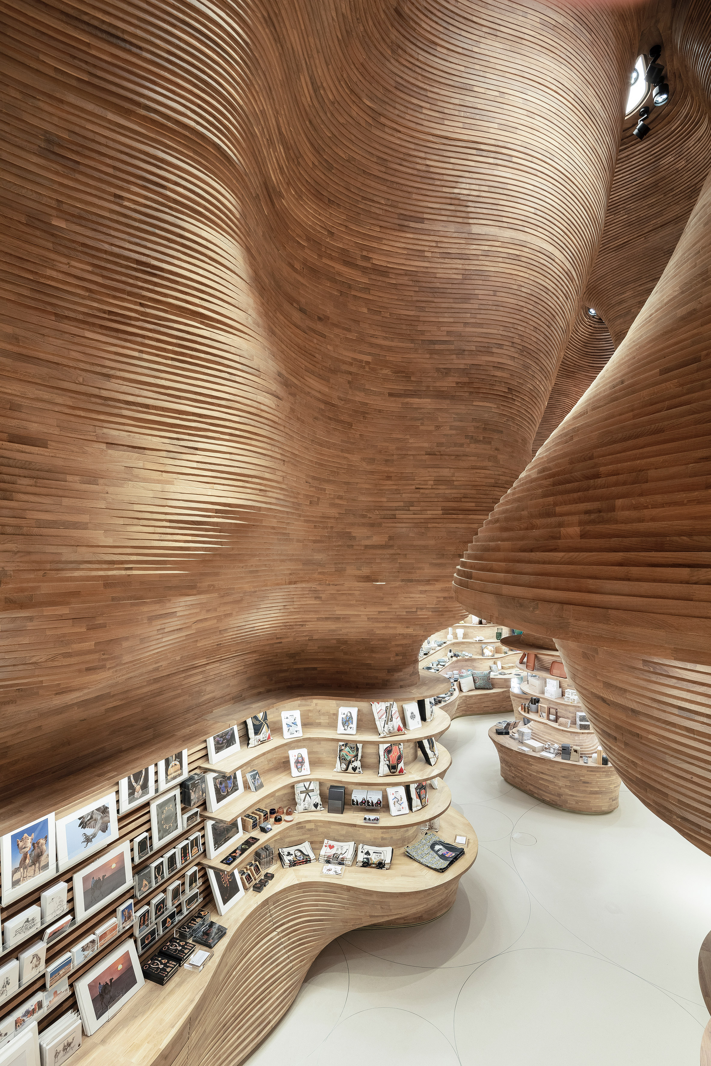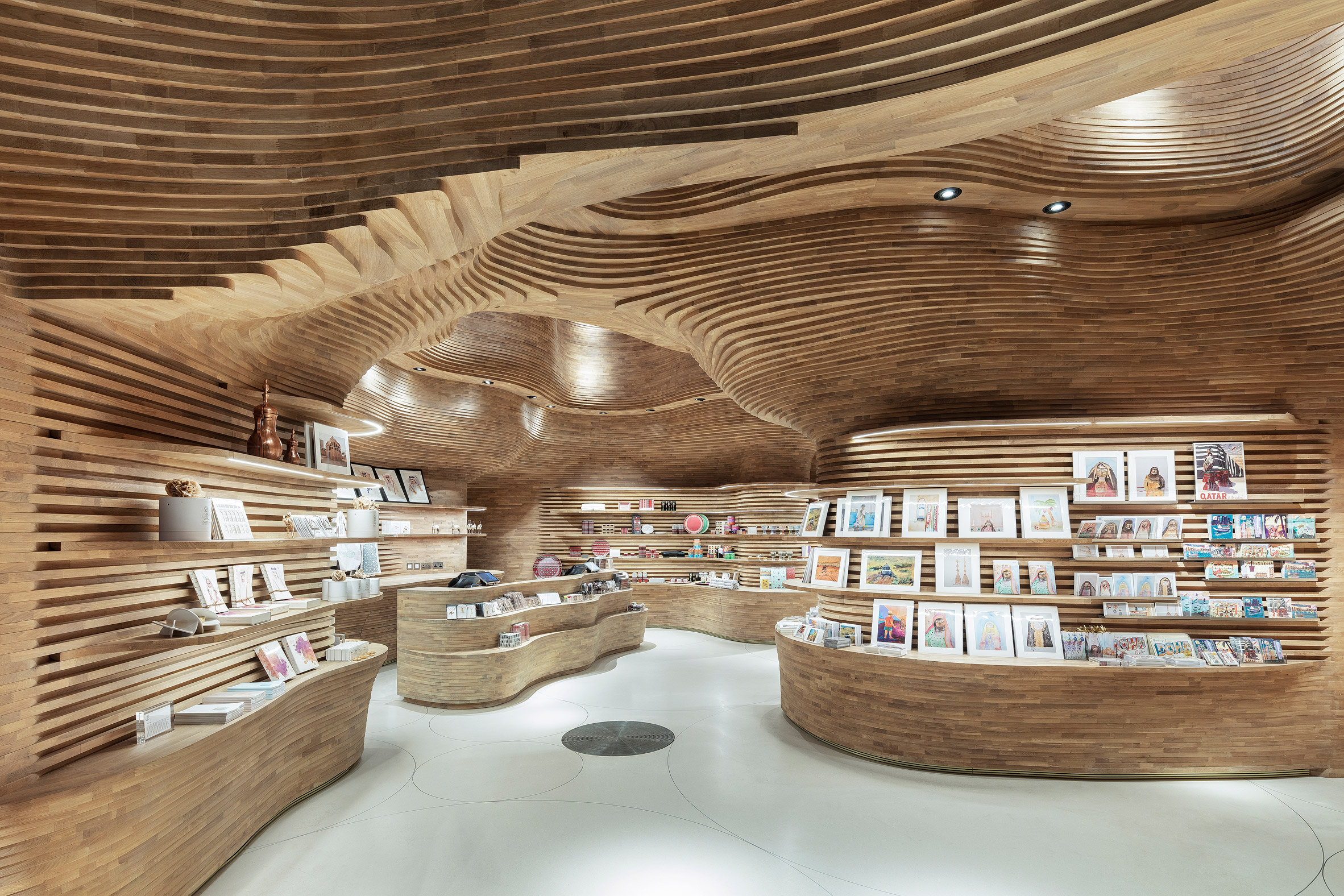 Le bureau australien Koichi Takada Architects a doté les deux boutiques de souvenirs du Musée National du Qatar à Doha - un musée conçu par Jean Nouvel - de surfaces en bois ondulées. L'aspect de grotte évoqué par ces surfaces est destiné à compléter la forme organique du bâtiment, inauguré en mars dernier.