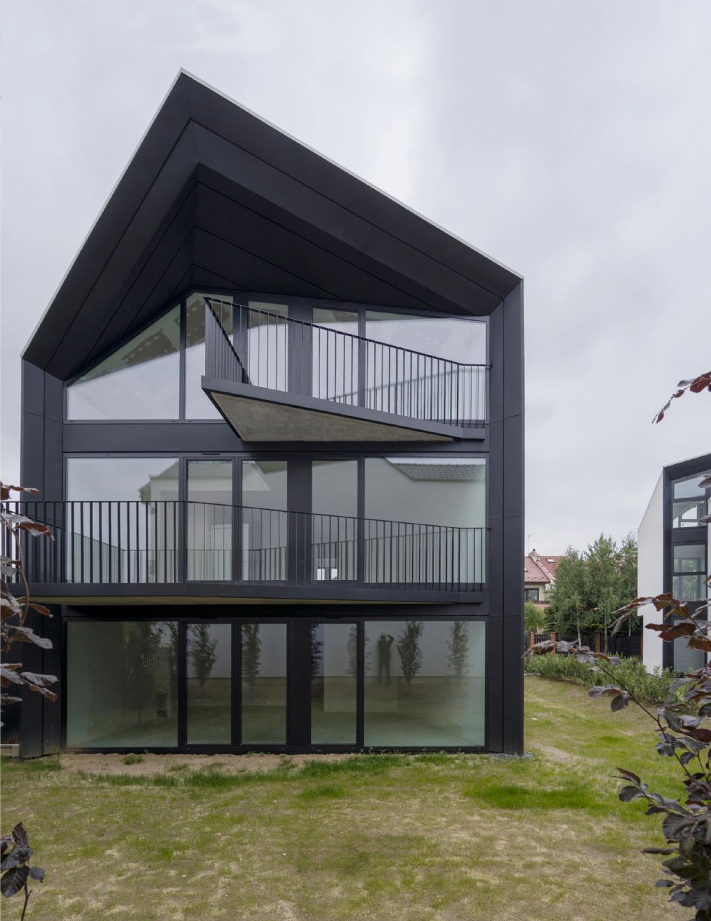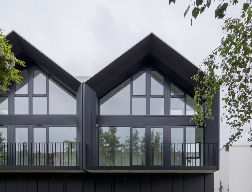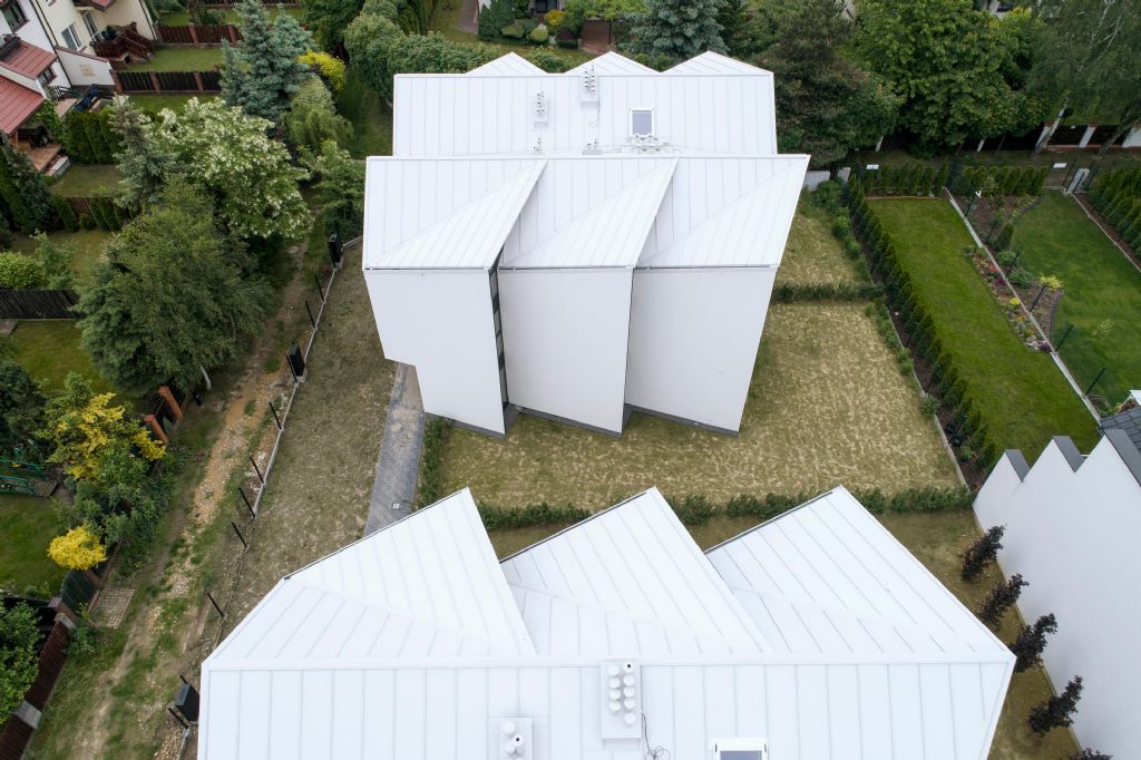 Nous ne sommes pas en bord de mer, mais au sud de la Pologne, dans le petit village de Zielonki, près de Cracovie. L'architecte Bartlomiej Drabik, du bureau Superhelix Pracownia Projektowa, a imaginé un ensemble de trois bâtiments atypiques, sur une parcelle centrale entourée de vis-à-vis. Atypiques par leur forme, leur uniformité de couleur et par l'espace vitré particulier qui les caractérise.