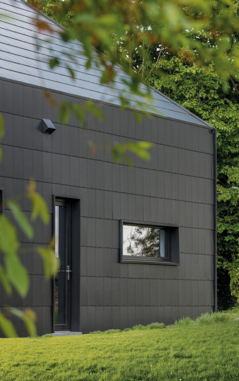 Cette construction neuve réalisée à Soignies dans la province de Hainaut est caractérisée par des lignes architecturales spéciales. Le volume massif est renforcé par le dessin des ardoises recouvrant à la fois le toit et la façade. L'habitation a été conçue par le Bureau d’Architecture 2G situé à Arquennes, tandis que Crohin Toitures SPRL s'est chargé de la pose des ardoises Eternit Alterna 60 x 32.