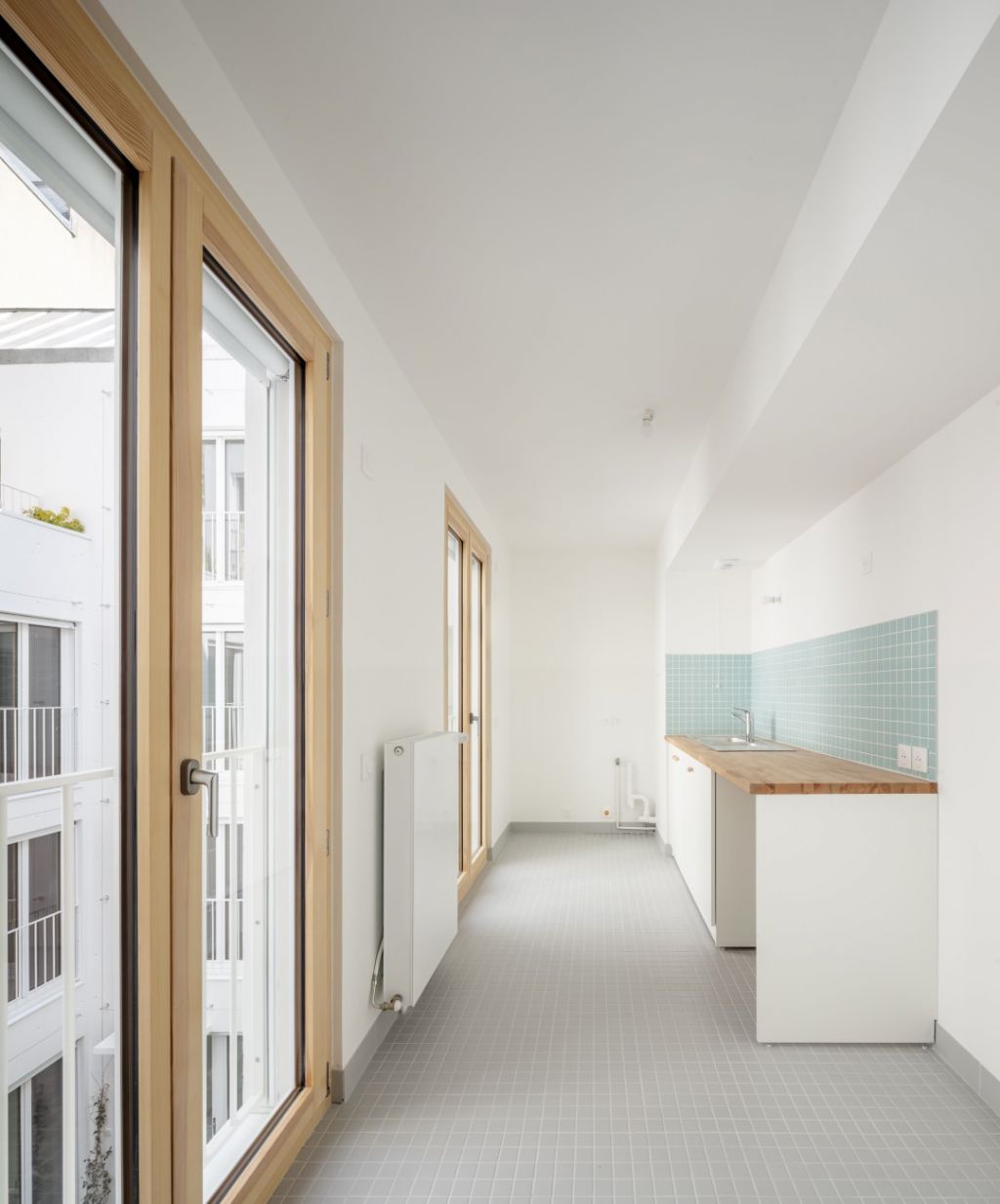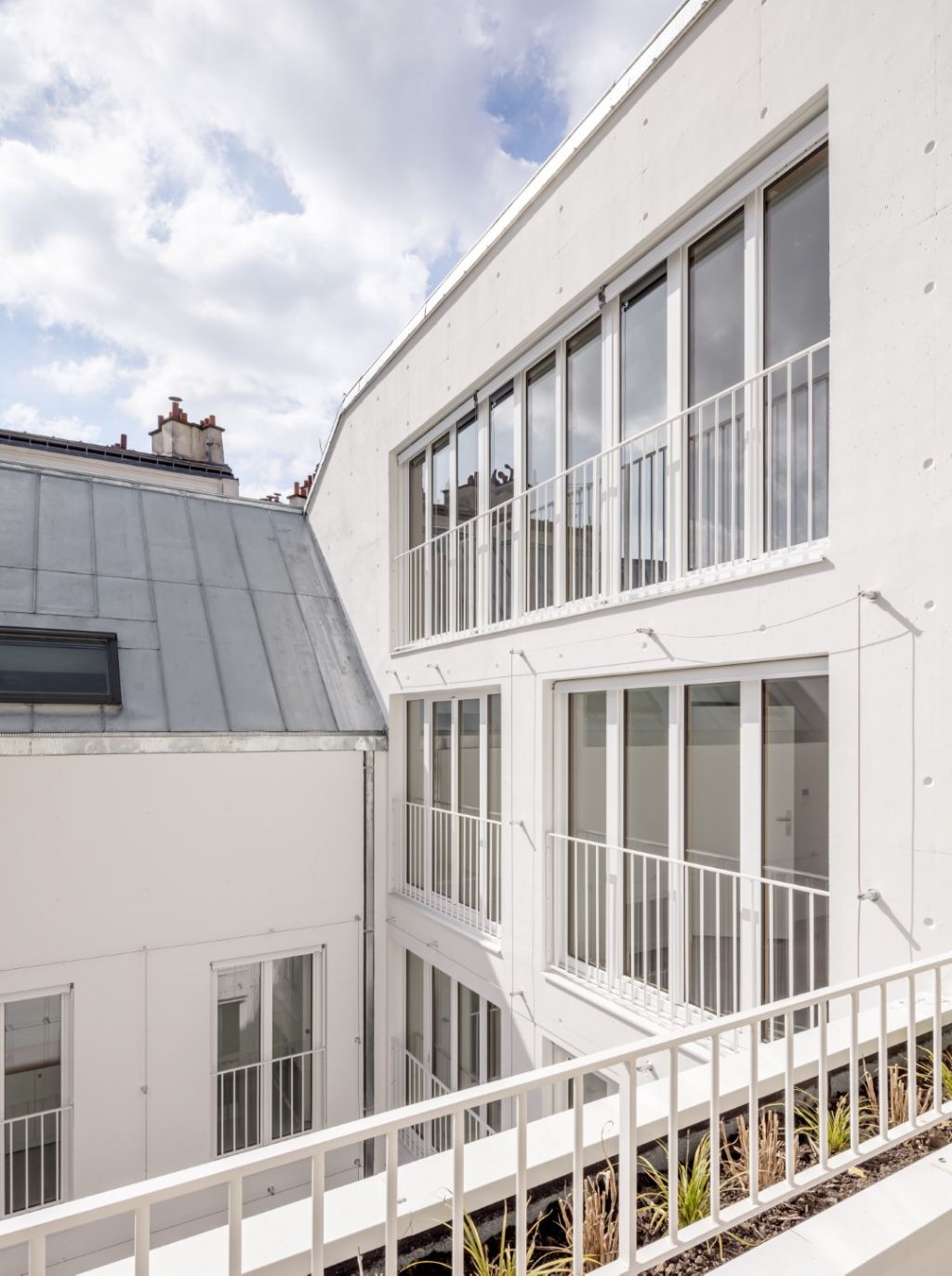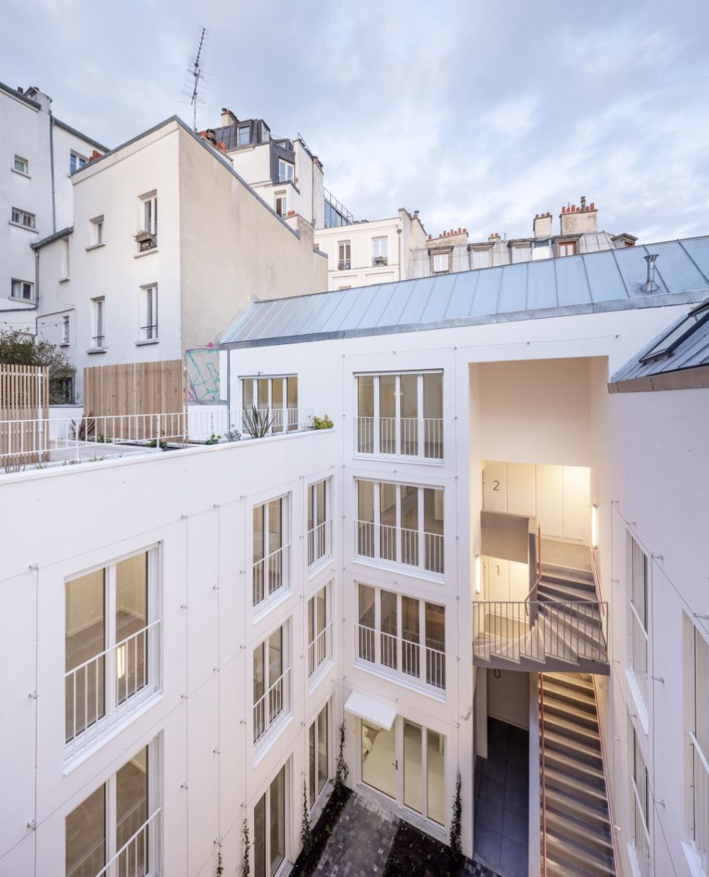 Ce dispositif de cour intérieure centrale permet aussi de créer un hall traversant, laissant apercevoir la cour depuis la rue. Cette cour est pavée et ses façades toutes blanches (béton peint, menuiseries bois-alu, garde-corps et stores) aux nombreuses fenêtres, rappelant celles des ateliers du 18e arrondissement, augmentent aussi la luminosité intérieure et accueillent des jasmins grimpants. De part et d’autre de la cour se trouvent l’escalier A qui offre de grands paliers où l’on peut imaginer des usages partagés entre voisins, et l’escalier extérieur B, qui tranche dans ce volume avec sa teinte grise.