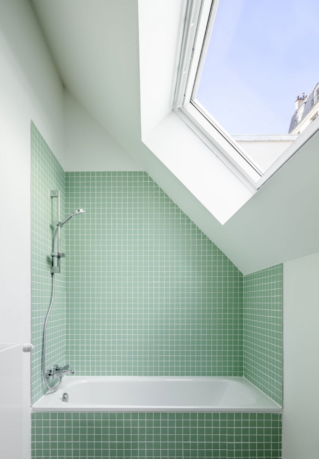 Pour habiter la parcelle de façon dense en y implantant les 14 logements et les deux commerces du programme, le projet maximise les linéaires de façade en créant une cour intérieure centrale, ainsi qu’une contre-courette en continuité avec la cour voisine. Les logements sont ainsi tous à double, triple ou quadruple orientation, toutes les cuisines et plusieurs salles de bain bénéficient de lumière naturelle. Le bâtiment tire parti au maximum du volume constructible en venant créer des duplex sous les combles, les pans de toiture donnant également l’occasion d’ouvrir des fenêtres supplémentaires vers le ciel.