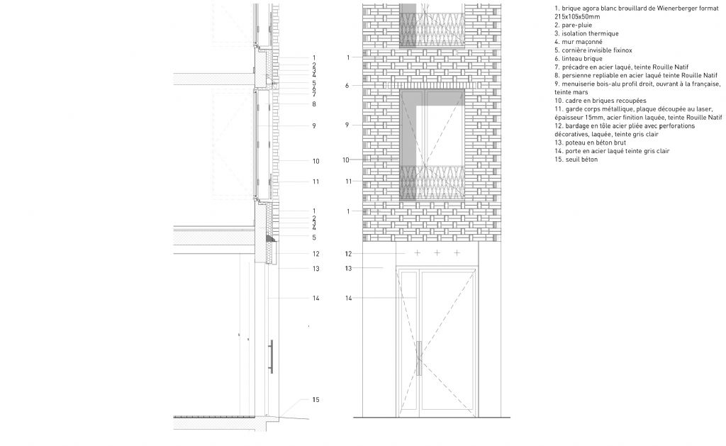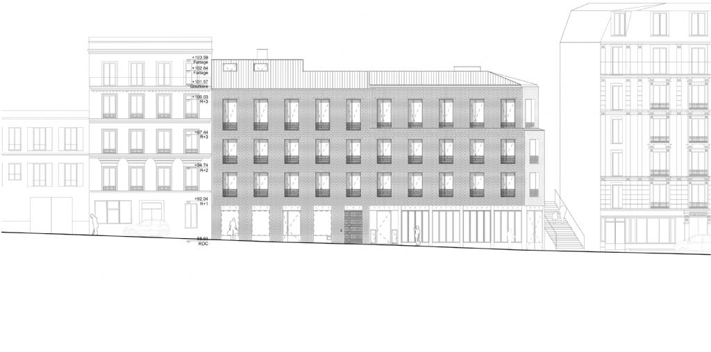 Afin de s’intégrer dans le quartier, les façades de l’immeuble réutilisent plusieurs archétypes de l’architecture faubourienne : la trame régulière des pleins et des vides, les ouvertures verticales de 120 cm de large, le retournement de la façade sur les deux parties de l’angle, la toiture en zinc à pans multiples, les persiennes en accordéon et les garde-corps ouvragés. Au rez-de-chaussée, les deux commerces adoptent chacun une écriture propre en façade, faisant écho aux devantures variées qui se succèdent dans la Rue des Trois Frères.
