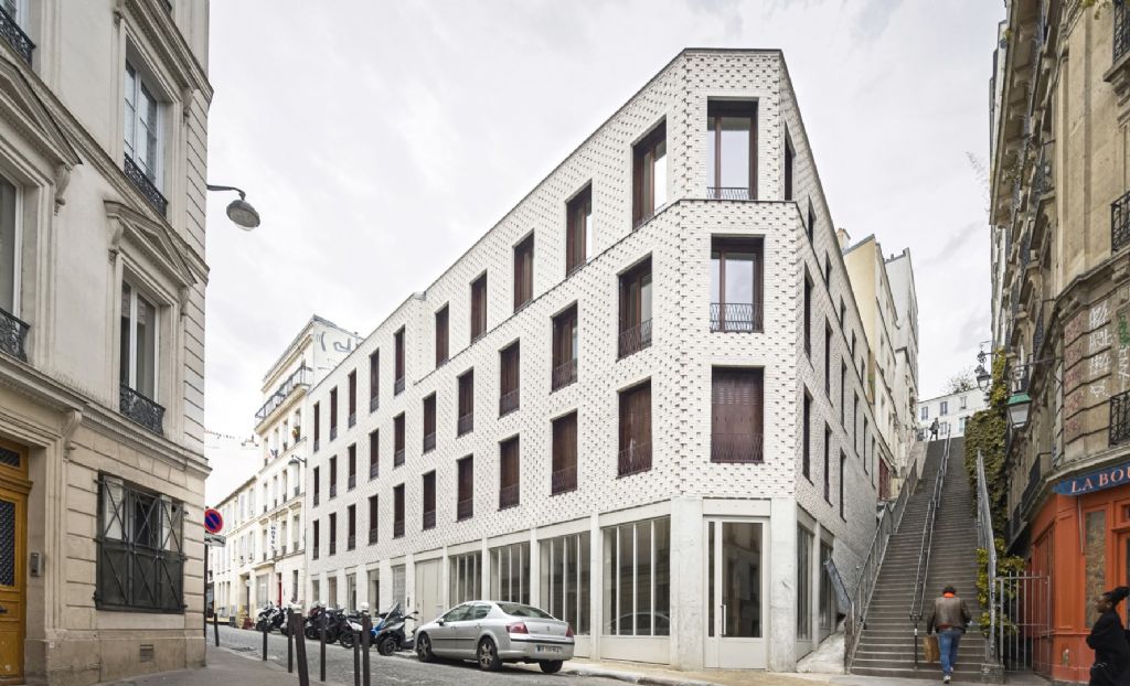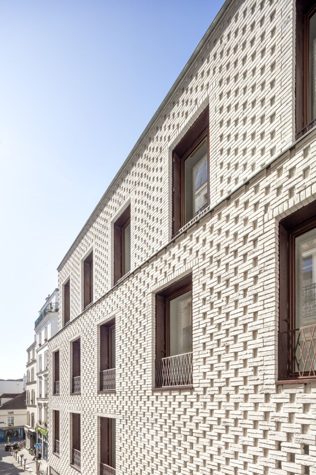 Sur une parcelle d'angle à Paris, Mobile Architectural Office a conçu des logements sociaux sobres, qui s'inscrivent parfaitement et discrètement dans un tissu urbain dense marqué par le relief escarpé de la Butte Montmartre. L'écriture contemporaine du projet se retrouve dans les volumes nets, les précadres soulignant l’épaisseur de la façade, ainsi que dans la brique blanche et sa modénature délicate qui dialoguent avec les ouvertures teinte rouille.