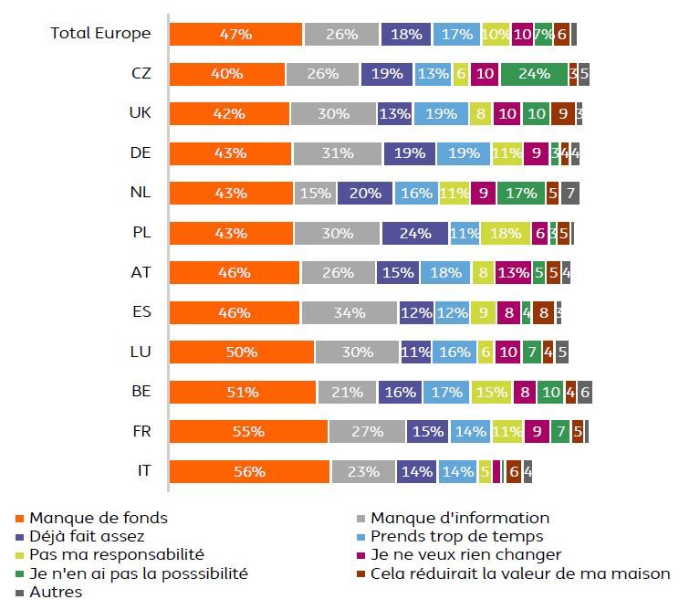 Dans notre enquête, les Belges n’apparaissent pas comme les plus dynamiques en matière d’investissement durable dans leur habitation : seuls 45% déclarent avoir déjà agi, et ils sont encore moins à penser qu’ils pourraient faire plus. Dans la plupart des pays européens, mais surtout en Espagne et au Royaume-Uni, la majorité des répondants pensent qu’ils pourraient faire plus. La conscientisation de l’existence même du problème pourrait donc encore faire du chemin en Belgique. Cependant, un certain nombre d’obstacles les en empêchent, et la question du coût des travaux semble centrale : plus de la moitié des Belges interrogés considèrent qu’ils manquent de budget (51%) et d’information (21%) pour agir, c’est beaucoup plus qu’aux Pays-Bas où les répondants semblent voir les coûts comme un moindre obstacle et considèrent avoir plus accès à l’information.