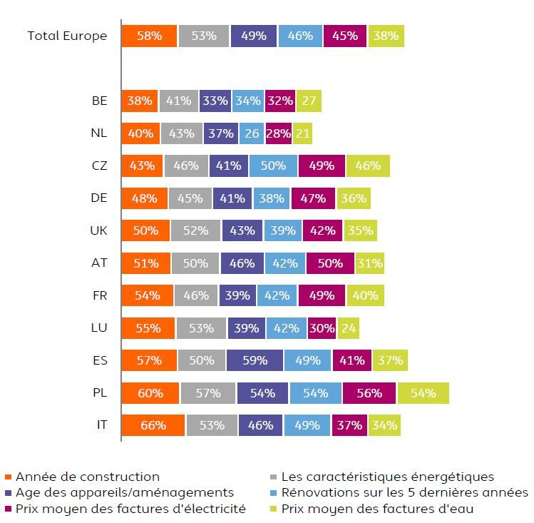 Dans notre enquête, les Belges apparaissent comme les acheteurs les moins attentifs à l’empreinte énergétique de leur habitation lors d’un achat immobilier. En Europe, la moitié des répondants déclarent en effet avoir considéré l’âge du logement et de ses aménagements ainsi que ses caractéristiques énergétiques avant d’acheter. Pour deux-tiers d’entre eux, cela relevait de la prudence financière plus que de la conscience énergétique, encore que plus d’un répondant sur quatre en Europe (28%) déclare y avoir prêté attention, une propension particulièrement élevée en Italie (43%).