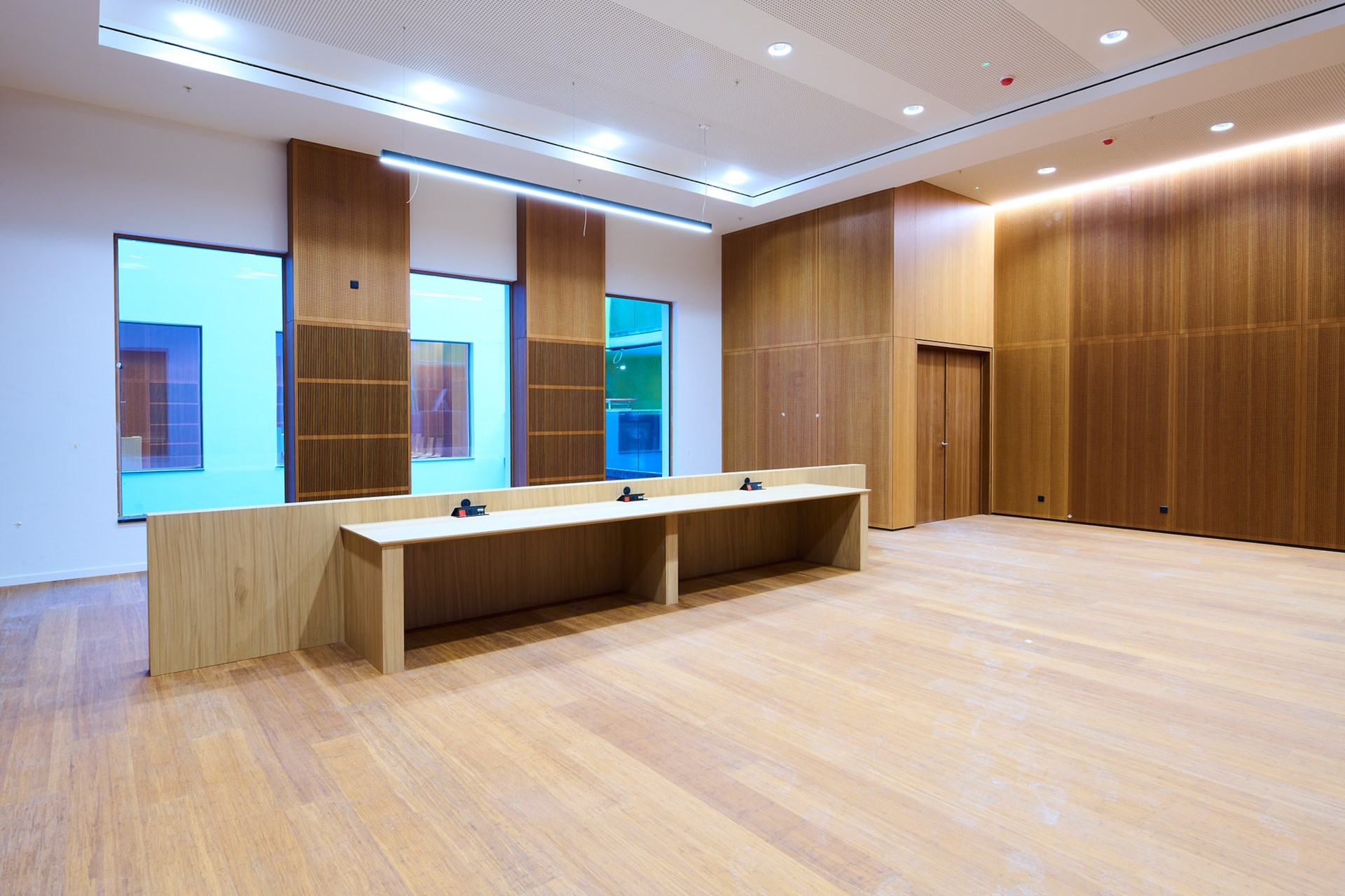Pour le Palais de Justice de Namur, Eribel a également livré des guichets modulaires certifiés à l’épreuve des balles (gamme SecuriTeq), un type de produit qu’il est le seul à proposer en Belgique. Par ailleurs, les exigences en matière d’acoustique étaient très élevées (jusqu’à 48 dB), notamment dans les nombreuses salles de réunion et d’interrogatoire. Gert Daniels : « La complexité du projet ne vient donc pas tant des quantités, mais de la combinaison de différentes caractéristiques (coupe-feu, pare-balle, acoustique, anti-effraction, …) pour un même élément. En plus de faire la différence dans le développement et la production, Eribel a assuré comme toujours une installation sans faille et une gestion approfondie du projet du début à la fin. »