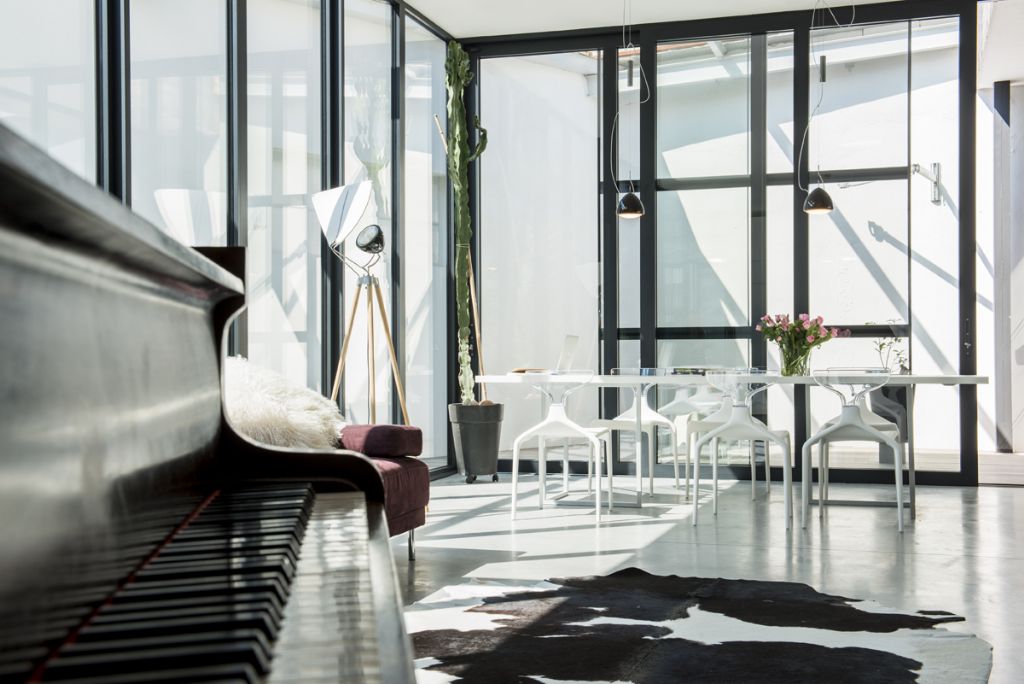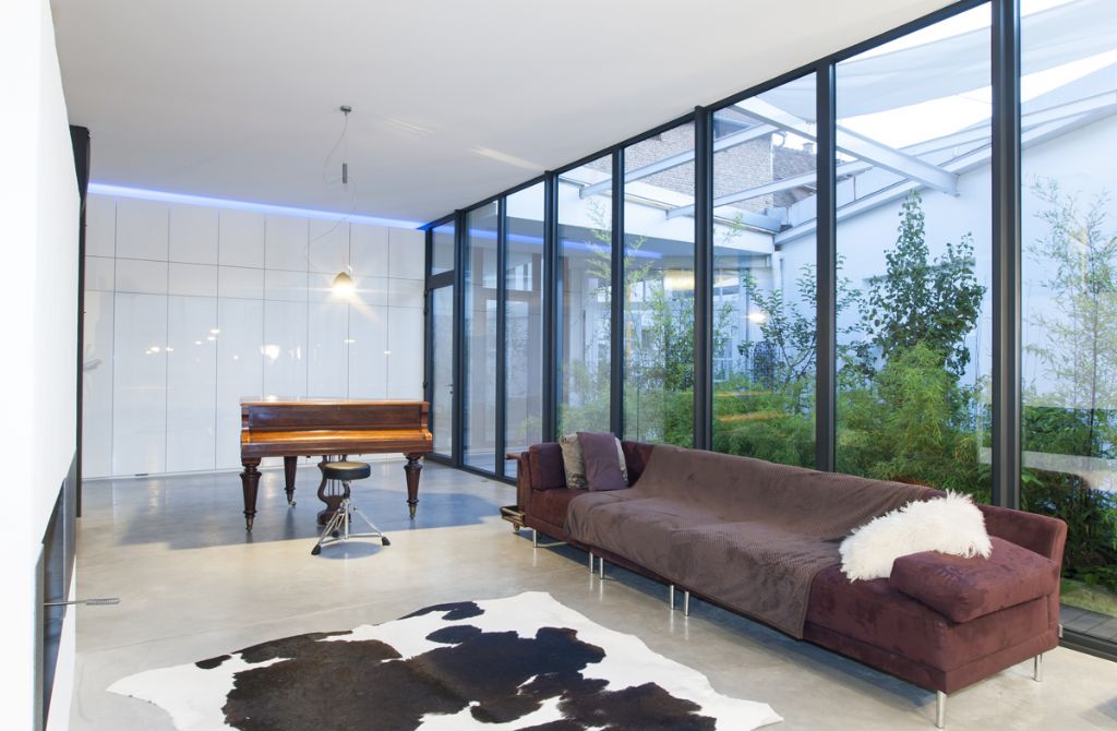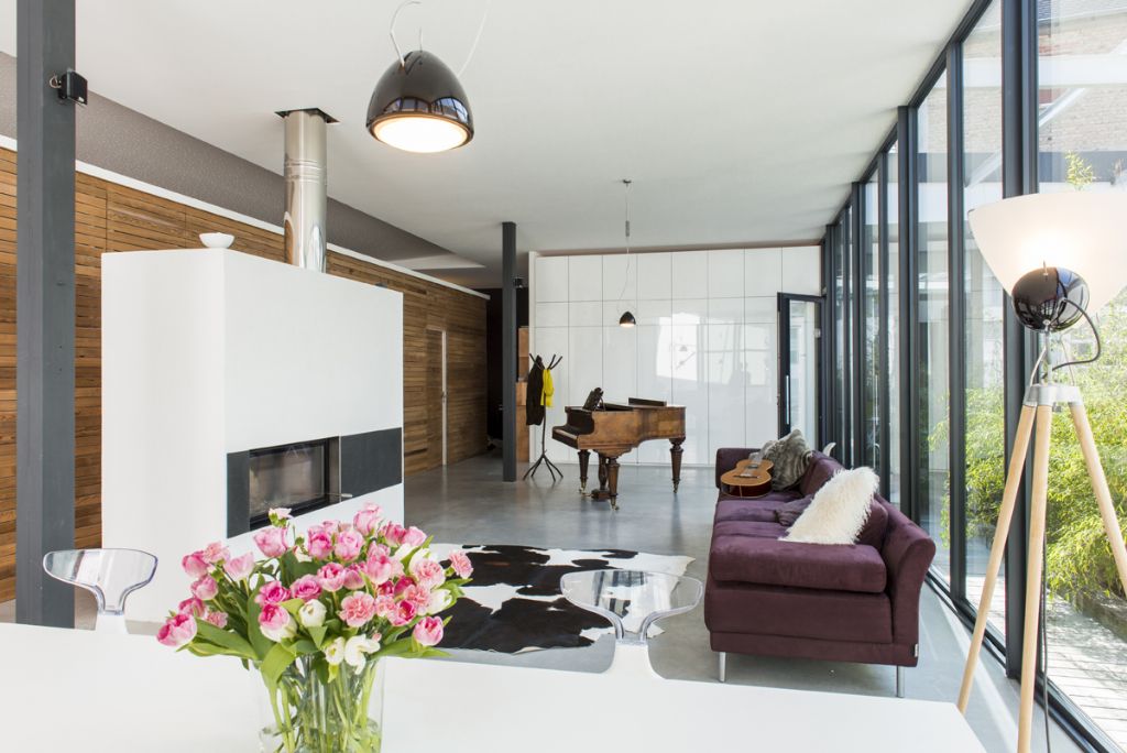 Dans le volume irrégulier de l’ancien atelier, les Bruckmanns ont, selon leurs propres mots, rétabli les angles droits. Ils ont supprimé le toit, tout en gardant des éléments de charpente visibles, puis ont placé au centre un parallélépipède. La lumière joue sur les murs blancs, y dessine des ombres changeantes, se reflète au travers des baies vitrées… Véronique : « Nous avons cherché à effacer les frontières entre l’extérieur et l’intérieur. Les portes coulissantes permettent d’élargir les espaces, de modifier les lieux de vie selon les moments de la journée. »