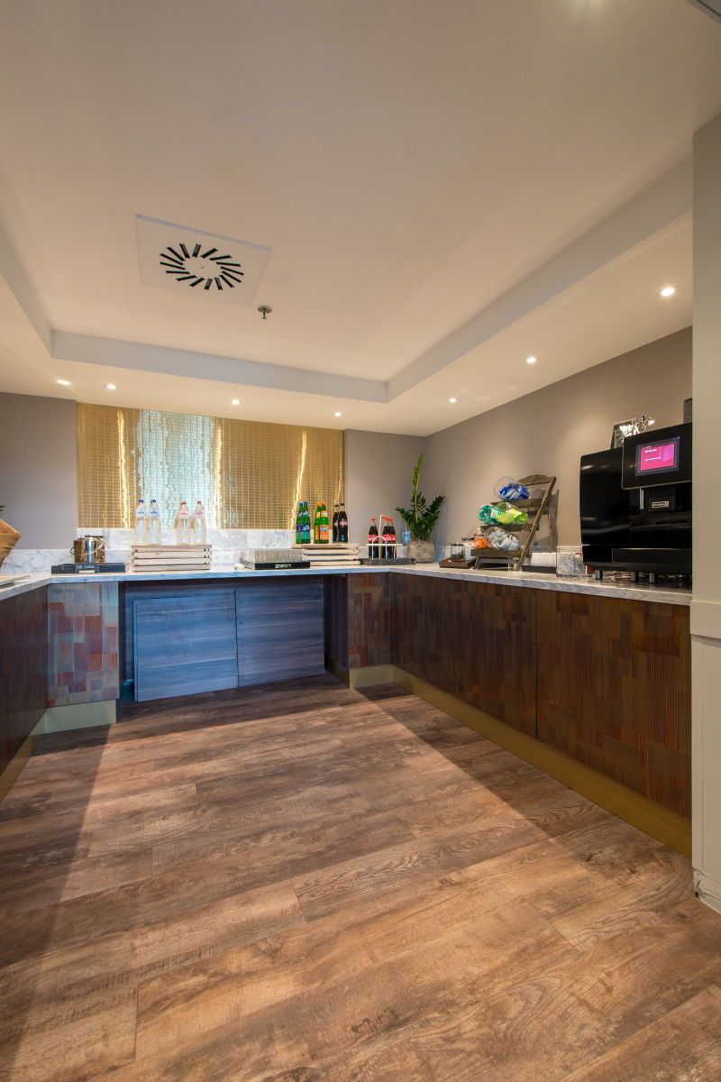 Un motif Custom Made XL Diamond a été privilégié dans la salle de petit-déjeuner. Un choix a été fait dans les collections complètes Moduleo Transform et Moduleo Impress. « Le designer londonien a opté ici pour une combinaison chaleureuse de la collection bois IMPRESS de trois couleurs, qui alternent de manière audacieuse et ludique avec une quatrième couleur de bois qui a été répétée de manière synchronisée. L’ensemble a été réalisé sur la base du motif Origami Moods, à savoir le XL, avec, une fois de plus, des couleurs personnalisées. Les salles ont été encadrées avec élégance à l’aide d’une lame Moduleo Impress standard, pour compléter le tout. Le projet initial en bois s’est révélé irréalisable pour des raisons budgétaires, et limitait en outre les possibilités. Ce qui a ouvert des perspectives pour un sol encore plus original et facile à entretenir qu’un parquet authentique. Cette solution est étanche, durable, ne doit pas être cirée ou poncée, est moins sujette aux dégradations dues, entre autres, aux talons aiguilles et autres charges concentrées lourdes. Il est pratiquement impossible de distinguer le sol du parquet, il reste beau plus longtemps et offre une plus-value acoustique par rapport au parquet et au sol stratifié », conclut Cnapelynck.