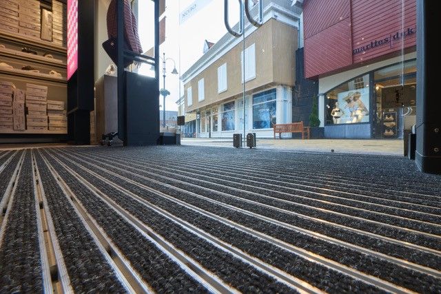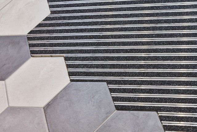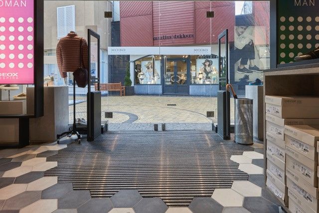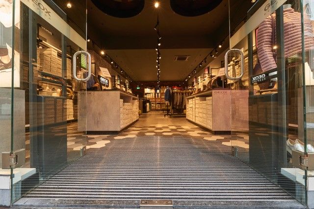 La plupart des tapis d'entrée d'emco sont réalisés sur mesure. Dans les magasins de chaussures GEOX, ce sont les tapis d'entrée DIPLOMATE d'emco qui ont été installés. Ils se devaient de correspondre parfaitement aux carreaux hexagonaux du sol.
