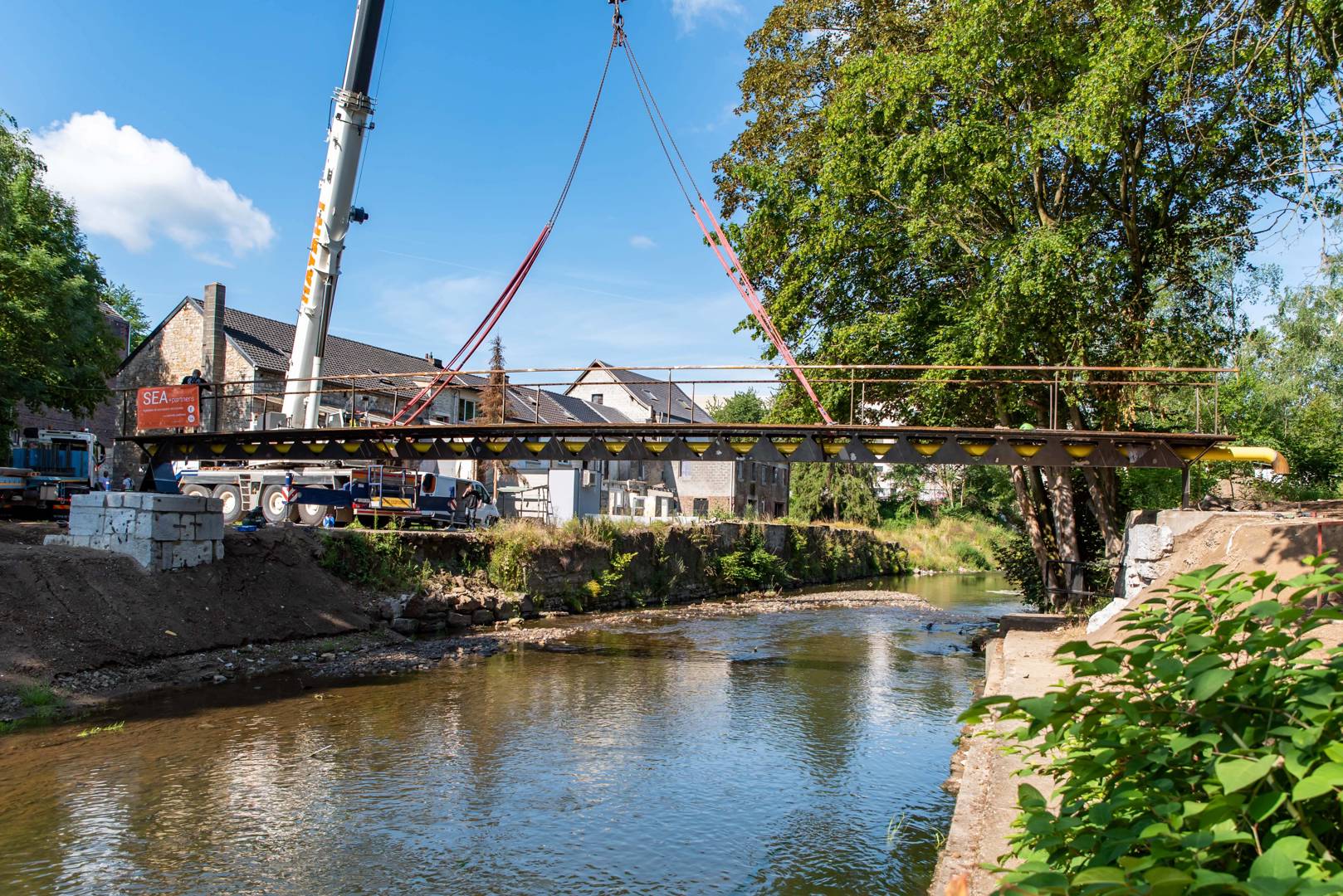 Emportée par la crue de juillet 2021, la passerelle a été reconstruite en s’appuyant sur les culées existantes restaurées. D’une portée principale de 21 mètres, elle intègre une conduite de gaz naturel de RESA dans une structure en acier auto-patinable de 3,8 tonnes, conçue comme une section ouverte en U perforée. Le projet associe fonction technique et usage public grâce à l’ajout d’un platelage en bois et d’escaliers d’accès, rétablissant une liaison intercommunale entre Verviers et Dison.