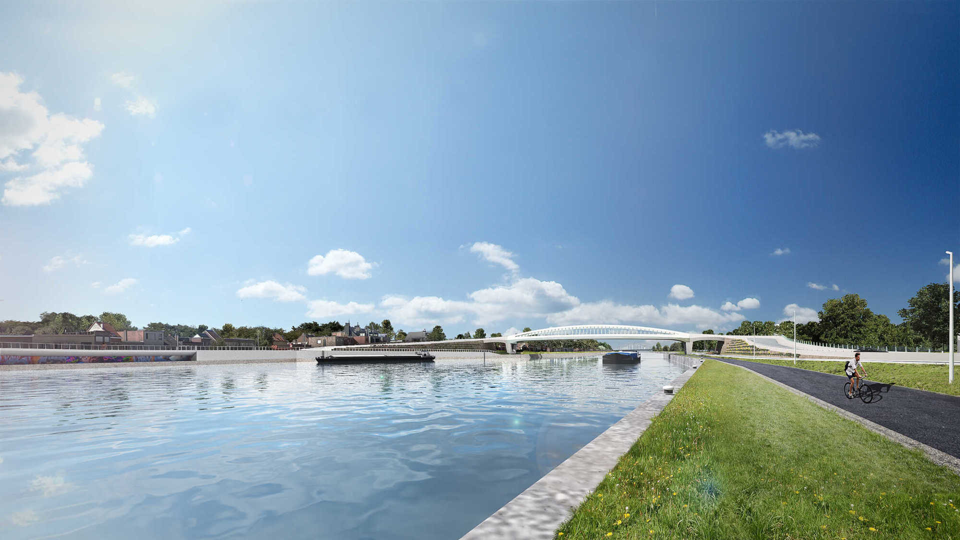À Wijnegem, la traversée du canal Albert, longtemps connue sous le nom de « bananenbrug », a été repensée par la réalisation de deux nouveaux ouvrages distincts : un pont routier et un pont pour cyclistes et piétons. Le projet est conçu par Zwarts & Jansma, avec une mise en œuvre entamée en 2023.