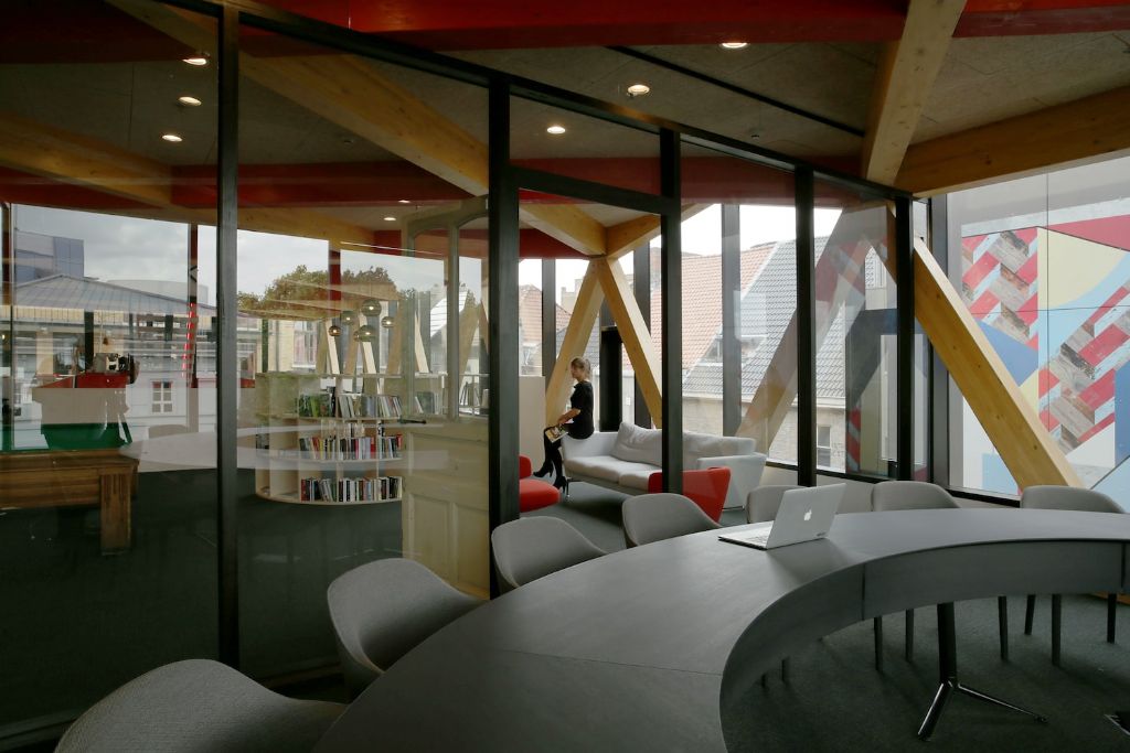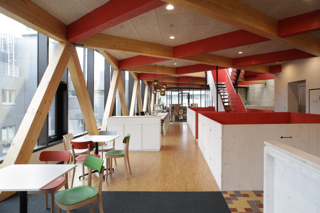 Pour favoriser une interaction maximale, le bâtiment a été conçu comme un quadruplex, ce qui signifie que les quatre étages supérieurs du bâtiment sont connectés de manière spatiale, matérielle, visuelle et acoustique. Tel une plante grimpante, l'escalier de cinq étages invite au mouvement, de l'atelier du rez-de-chaussée au jardin de toiture. Les marches et les paliers de bois s'équilibrent sur cette colonne vertébrale. Une rampe de LED renforce les limons de l'escalier peints en rouge et guide le visiteur. Un ascenseur est disponible, mais est peu utilisé. On découvre également une pièce ovale, des sièges douillets, un amphithéâtre pour des sessions de groupe, des espaces pour travailler et se réunir debout, une table de lecture, un billard et une table de ping-pong... partout une invitation à aller consciemment vers l'autre d'une manière différente de l'habitude.