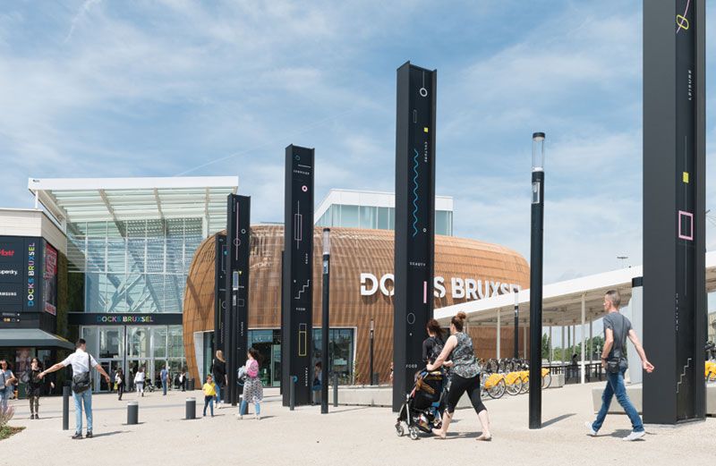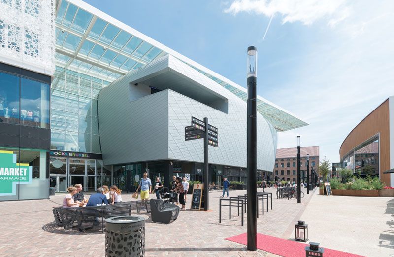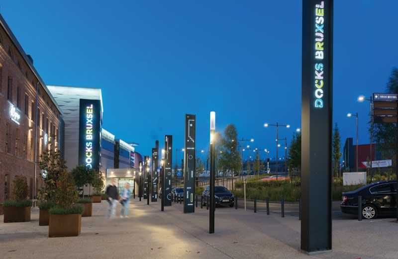 Le complexe Docks Bruxsel a donc naturellement été conçu comme un véritable quartier avec des rues, des places, des espaces verts, du mobilier urbain pour créer un espace public convivial, favorisant les échanges et les moments de détente. L’ensemble du projet a également été conçu avec la volonté d’en faire un site exemplaire en matière de développement durable, en utilisant les ressources naturelles du site, mais aussi en développant des solutions innovantes : la verrière qui permet aux chalands de profiter de la lumière naturelle tout en étant à l’abri des intempéries, ou la récupération de chaleur de l’incinérateur tout proche. L’éclairage a été réfléchi dans la même philosophie, en exploitant la technologie LED, peu énergivore, sur l’ensemble du site.
