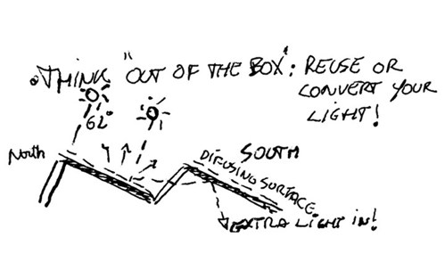LE SAVIEZ VOUS : Utiliser un miroir pour rediriger la lumière solaire directe vers un endroit où elle est absente est un point de départ intéressant. La loi est la suivante : angle d'incidence = angle de sortie. Mais ce n'est pas facile car le soleil bouge ! Veillez à ne pas éblouir vos voisins ou vous-même. Veillez également à ne pas utiliser les miroirs pour provoquer ce que vous vouliez éviter. Ajouter des miroirs sur le côté sud d'un toit en shed n'est pas la bonne solution, car vous provoquerez une surchauffe là où vous vouliez l'éviter. Les miroirs n'émettent pas de chaleur et n'absorbent donc pas d'énergie : le risque de surchauffe demeure. Vous pouvez toutefois rendre cette surface blanc mat pour diffuser la lumière directe et la renvoyer par le nord. Les miroirs peuvent être utilisés pour créer et mettre en valeur de nouvelles vues.