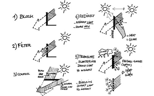 Le blocage est idéal pour empêcher la lumière directe de passer par la fenêtre afin d'éviter la surchauffe ; l'astuce consiste à ne bloquer que ce que l'on ne veut pas au moment où l'on ne veut pas que cela passe. On peut décider de laisser passer une lumière plus faible (matin et soir, début d'année et fin d'année).