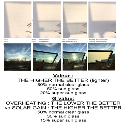 Valeur G : Voir Gain solaire et Paradoxe ci-dessus. Le problème est que plus le verre est clair, plus la valeur G est élevée, ce qui entraîne une production de chaleur plus importante. Idéalement, on souhaiterait que ce soit l’inverse…
