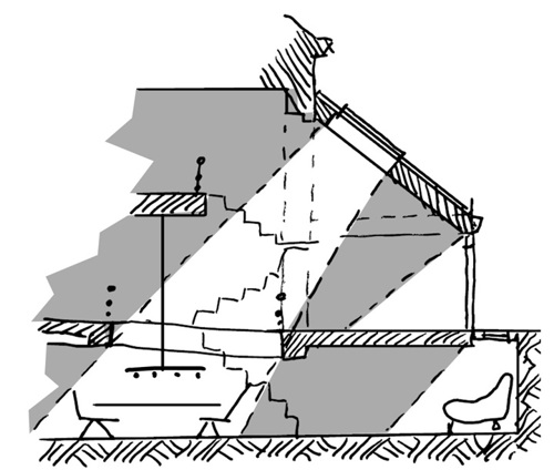 - Créer un vide le long d’une façade extérieure permet à la lumière de pénétrer plus profondément dans l’habitation. La fonction de l’espace adjacent peut alors évoluer : par exemple, une salle de bain peut devenir un bureau ou une bibliothèque. Les avantages sont considérables : vous reliez deux niveaux, vous créez du volume, et la lumière, venant d’en haut, atteint des zones bien plus profondes. Souvent, il est même possible de connecter l’escalier à ce vide, ce qui permet de gagner en espace et en possibilités d’aménagement.