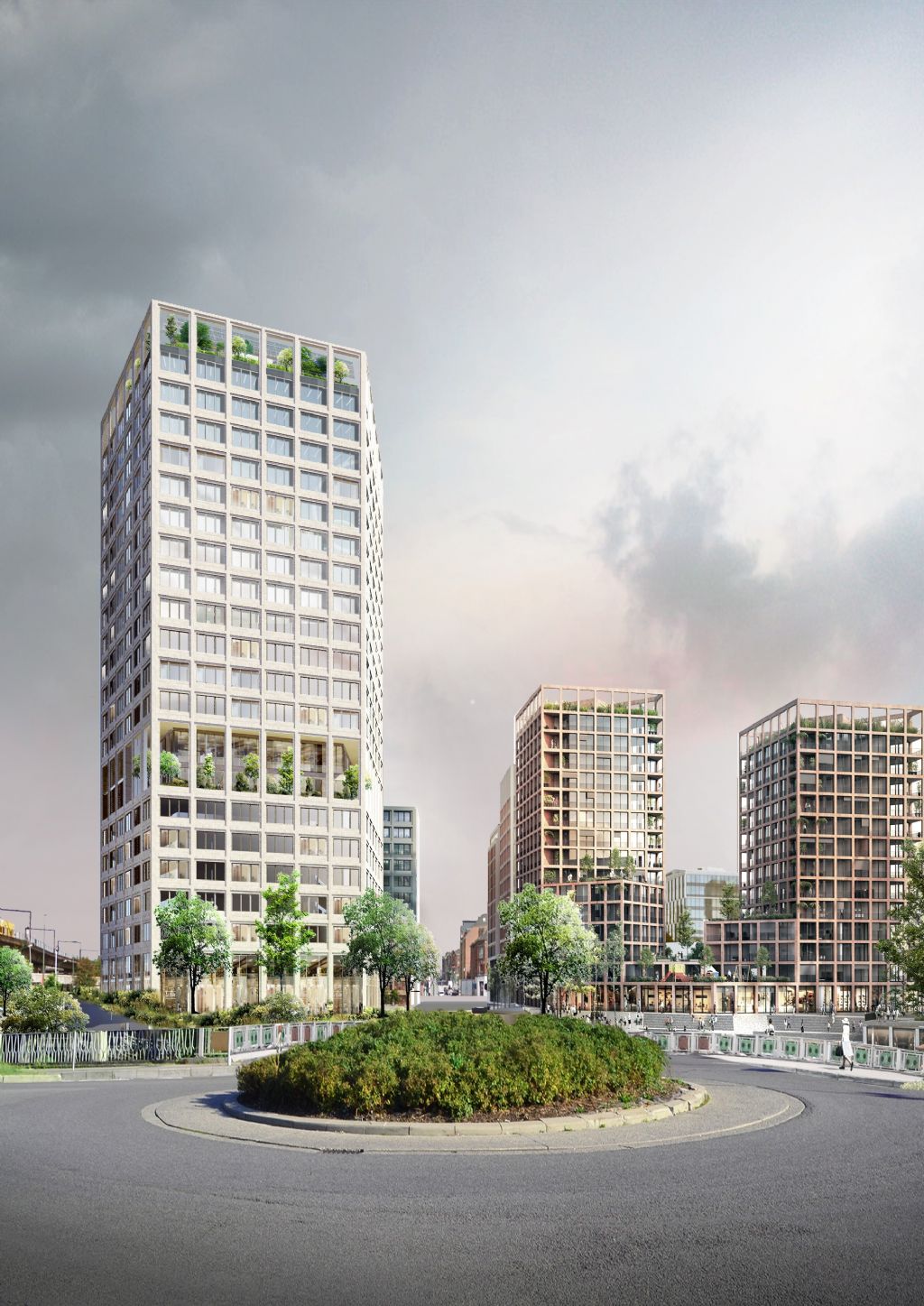 L’émergence de 23 niveaux accueille une programmation de bureaux sur 23.000 m2 hors-sol et 10.000 m2 en sous-sol. Le bâtiment s’implante au bord de la future halte nautique , la ‘Place bleue’ et redessinera la Skyline de la métropole en culminant à 85m de hauteur. Le volume exprime une identité forte en dialogue avec le territoire. Son plan pentagonal régulier (en clin d’oeil à Vauban) réduit son empreinte au sol pour une offrir une esplanade généreuse et propose depuis l’intérieur des orientations multiples sur le grand paysage. L’esplanade à la fois minérale et végétale s’inscrit dans la continuité du boulevard Tirou et donne un accès direct à la station de métro Villette. Le projet en terme de mobilité bénéficie également de la proximité immédiate de la gare du Sud et de la gare des bus. Il accueille également de multiples emplacements vélos et voitures électriques pour les futurs usagers.