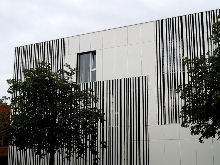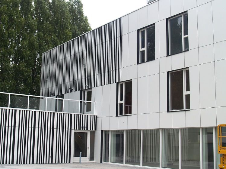 La trame est basée sur les composantes du système de préfabrication sans que les espaces n'en subissent les contraintes. Les volumes simples créent un ensemble cohérent, des qualités spatiales et un grand éclairement naturel. Le décalage de volumes entre les deux niveaux permet également une grande aire de jeux au niveau de l'étage. Le bardage ajouré, blanc sur fond noir, est constitué de panneaux de façade découpés en lames de largeurs variées accentuant la notion de flexibilité de cette construction préfabriquée. Ce contraste noir/blanc donne une identité forte à ce bâtiment scolaire et présence lumineuse dans l'environnement vert. Chaque espace intérieur est personnalisé par une couleur (sol et menuiseries).