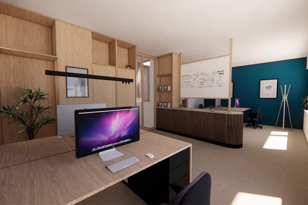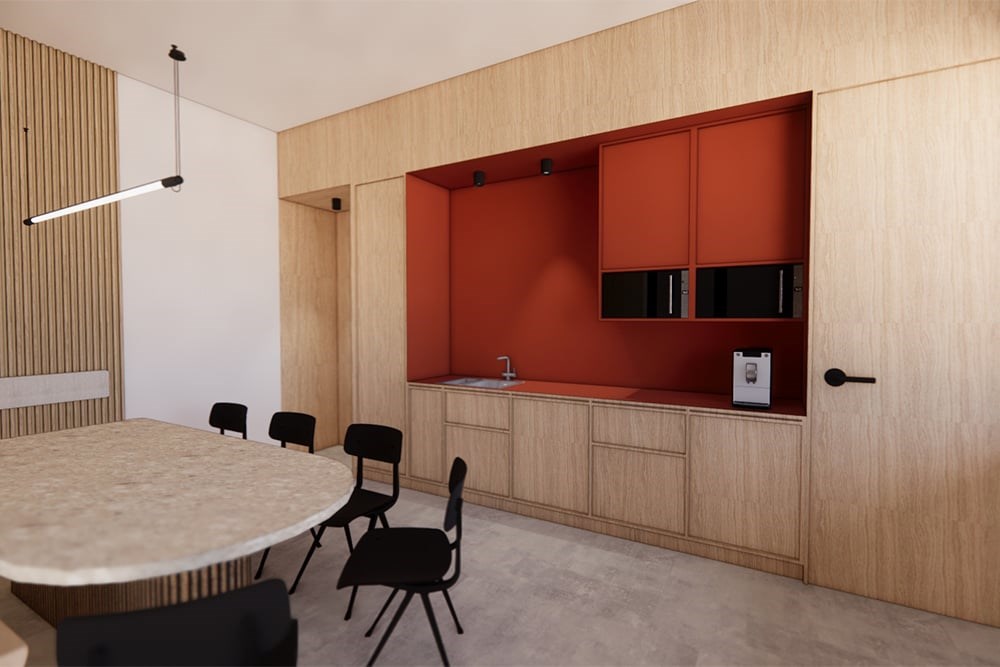 Au niveau de son design intérieur, le nouveau bâtiment se veut une vitrine du savoir-faire de la menuiserie : grandes portes toute hauteur sur cadres en dormant massif, bardage bois, mobiliers sur mesure dans les espaces communs, la cuisine et les bureaux … Tanguy Wolters : « Le bureau de design liégeois Twodesigners a planché sur l’aménagement intérieur pour alimenter notre réflexion. C’était avec eux que nous avions travaillé pour EyeD Pharma/UniD Manufacturing au Sart-Tilman, qui est l’une des plus belles références de la menuiserie. »