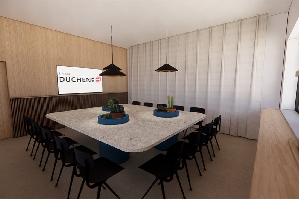 « Au moment d’écrire des lignes, l’intégration des techniques spéciales dans les plafonds s’achève et les travaux de peinture vont débuter, de même que la pose des revêtements de sol », précise Julien Hazée, conducteur de ce chantier « d’auto-construction ». Ce n’est en effet pas tous les jours que l’on construit pour soi-même. Duchêne a cependant organisé et mené ce chantier comme tous les autres, seul le mobilier venant de la menuiserie ayant été un peu décalé pour faire place à des commandes externes.